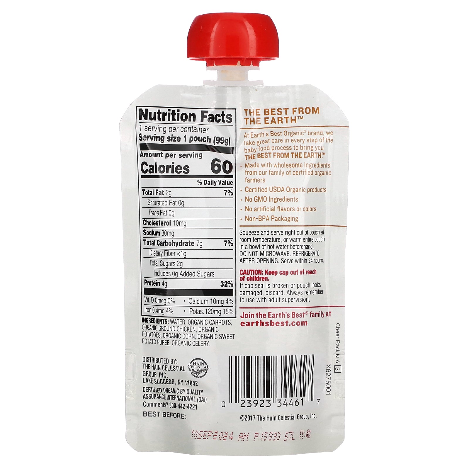 Water, organic carrots, organic ground chicken, organic potatoes, organic corn, organic sweet potato puree, organic celery.