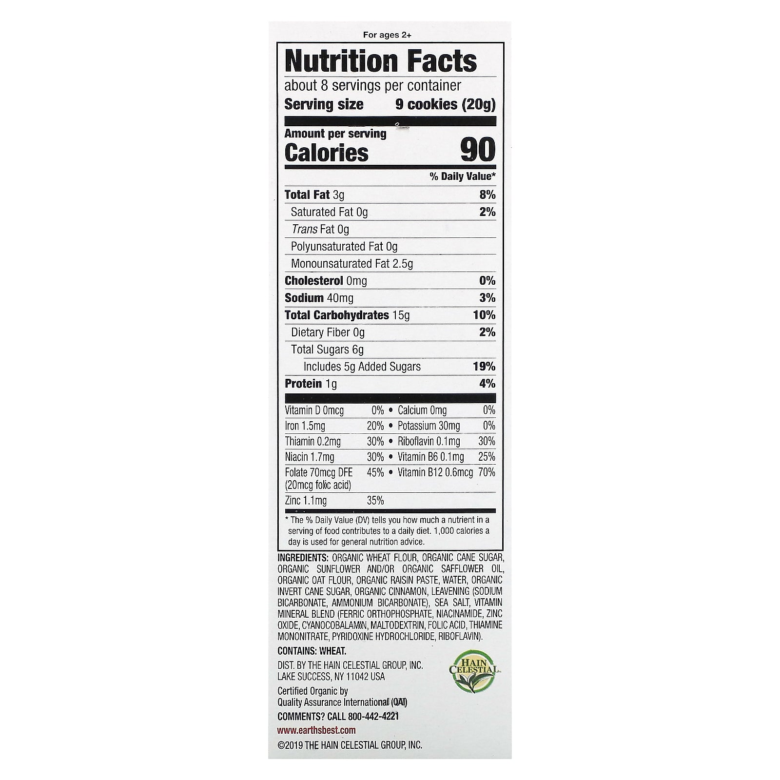 Organic wheat flour, organic cane sugar, organic sunflower and/or organic safflower oil, organic oat flour, organic raisin paste, water, organic invert cane sugar, organic cinnamon, leavening (sodium bicarbonate, ammonium bicarbonate), sea salt, vitamin mineral blend (ferric orthophosphate, niacinamide, zinc oxide, cyanocobalamin, maltodextrin, folic acid, thiamine mononitrate, pyridoxine hydrochloride, riboflavin).
