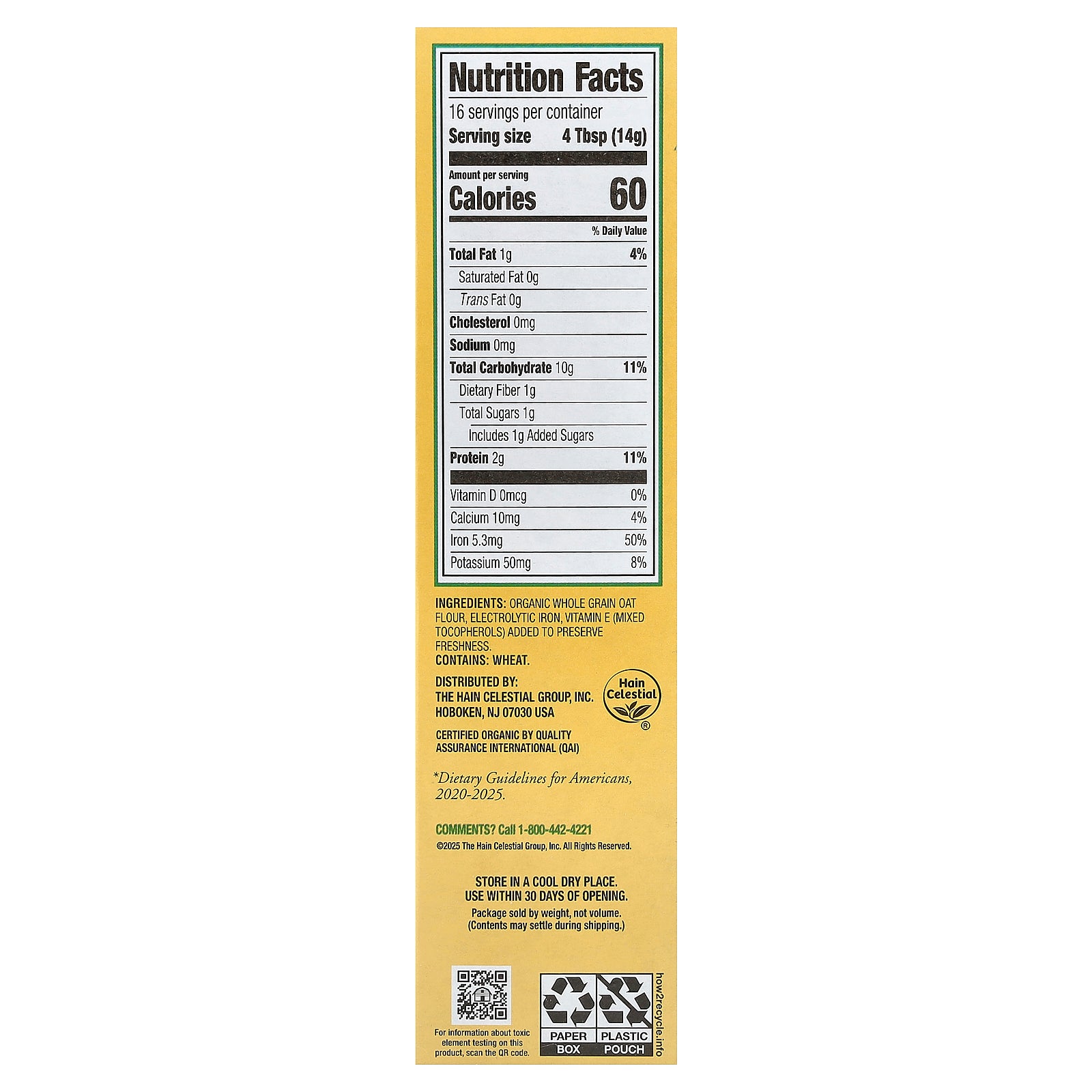 Organic whole grain oat flour, electrolytic iron, vitamin e (mixed tocopherols) added to preserve freshness.