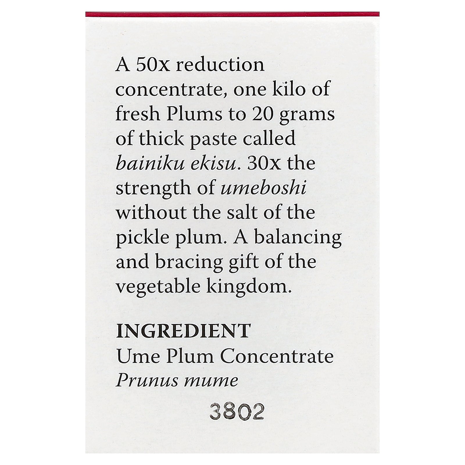 A 50x reduction concentrate, one kilo of fresh Plums to 20 grams of thick paste called bainiku ekisu. 30x the strength of umeboshi without the salt of the pickle plum. A balancing and bracing gift of the vegetable kingdom.