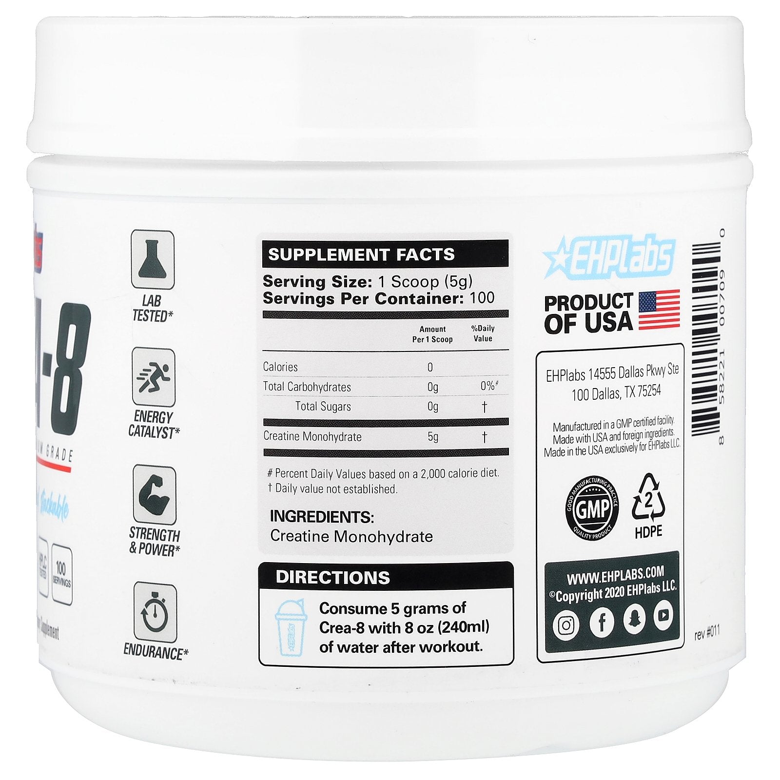 CREA-8™ is bio-available Creatine Monohydrate. Creatine is highly concentrated in the muscle where it is necessary for the production of energy through the recycling of the energy molecule adenosine triphosphate (ATP). Supplementary creatine during lifting and high-intensity exercise ensures that muscle stores of creatine are maintained in order for muscles to meet their energy demands. With CREA-8™ you can rest assured that EHPlabs has sourced the best quality Creatine Monohydrate for you to reach your goals.
