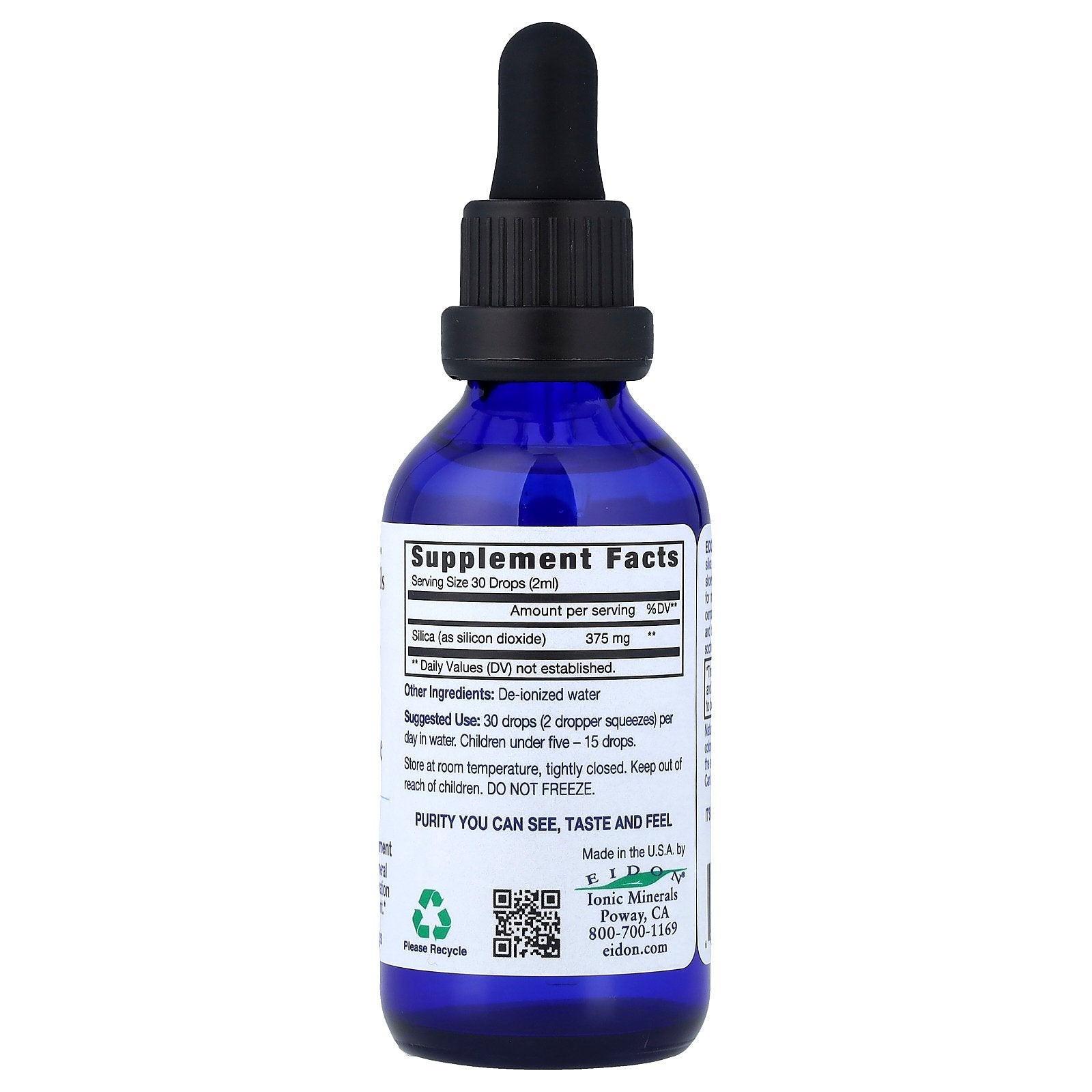 Eidon Silica: Today most diets are severely lacking in silica due to over refinement of grains. Silica has been shown to be essential for proper storage of calcium and for maintaining healthy connective tissue - a key component of cardiovascular, gastrointestinal, joint and bone tissues. Silica may also be applied topically to soothe the skin.