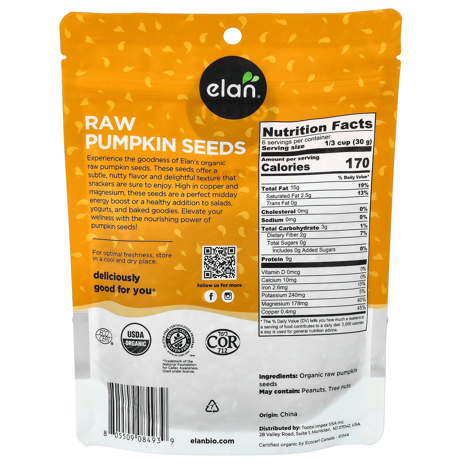 Experience the goodness of Elan's organic raw pumpkin seeds. These seeds offer a subtle, nutty flavor and delightful texture that snackers are sure to enjoy. High in copper and magnesium, these seeds are a perfect midday energy boost or a healthy addition to salads, yogurts, and baked goodies. Elevate your wellness with the nourishing power of pumpkin seeds!
