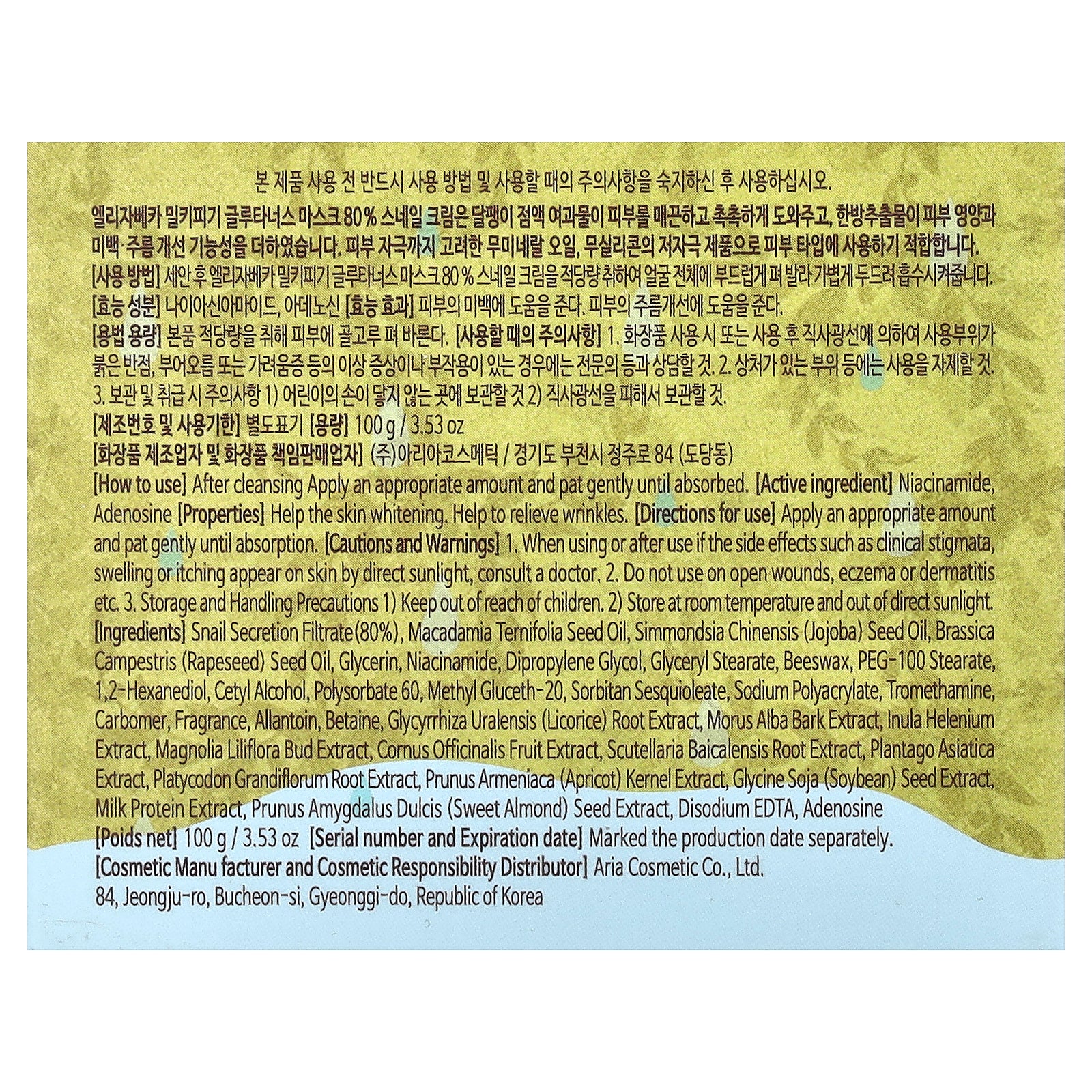 Snail secretion filtrate (80%), macadamia ternifolia seed oil, simmondsia chinensis (jojoba) seed oil, brassica campestris (rapeseed) seed oil, glycerin, niacinamide, dipropylene glycol, glyceryl stearate, beeswax, peg-100 stearate, 1,2-hexanediol, cetyl alcohol, polysorbate 60, methyl gluceth-20, sorbitan sesquioleate, sodium polyacrylate, tromethamine, carbomer, fragrance, allantoin, betaine, glycyrrhiza uralensis (licorice) root extract, morus alba bark extract, inula helenium extract, magnolia liliflora bud extract, cornus officinalis fruit extract, scutellaria baicalensis root extract, plantago asiatica extract, platycodon grandiflorum root extract, prunus armeniaca (apricot) kernel extract, glycine soja (soybean) seed extract, milk protein extract, prunus amygdalus dulcis (sweet almond) seed extract, disodium edta, adenosine.