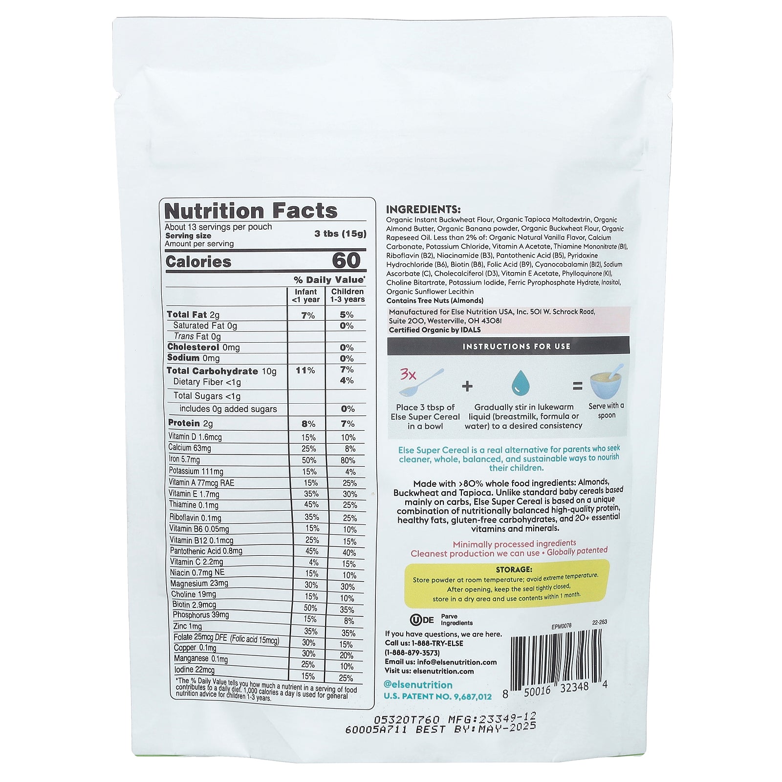 Made with >80% whole food ingredients: Almonds, Buckwheat and Tapioca. Unlike standard baby cereals based mainly on carbs, Else Super Cereal is based on a unique combination of nutritionally balanced high-quality protein, healthy fats, gluten-free carbohydrates, and 20+ essential vitamins and minerals.