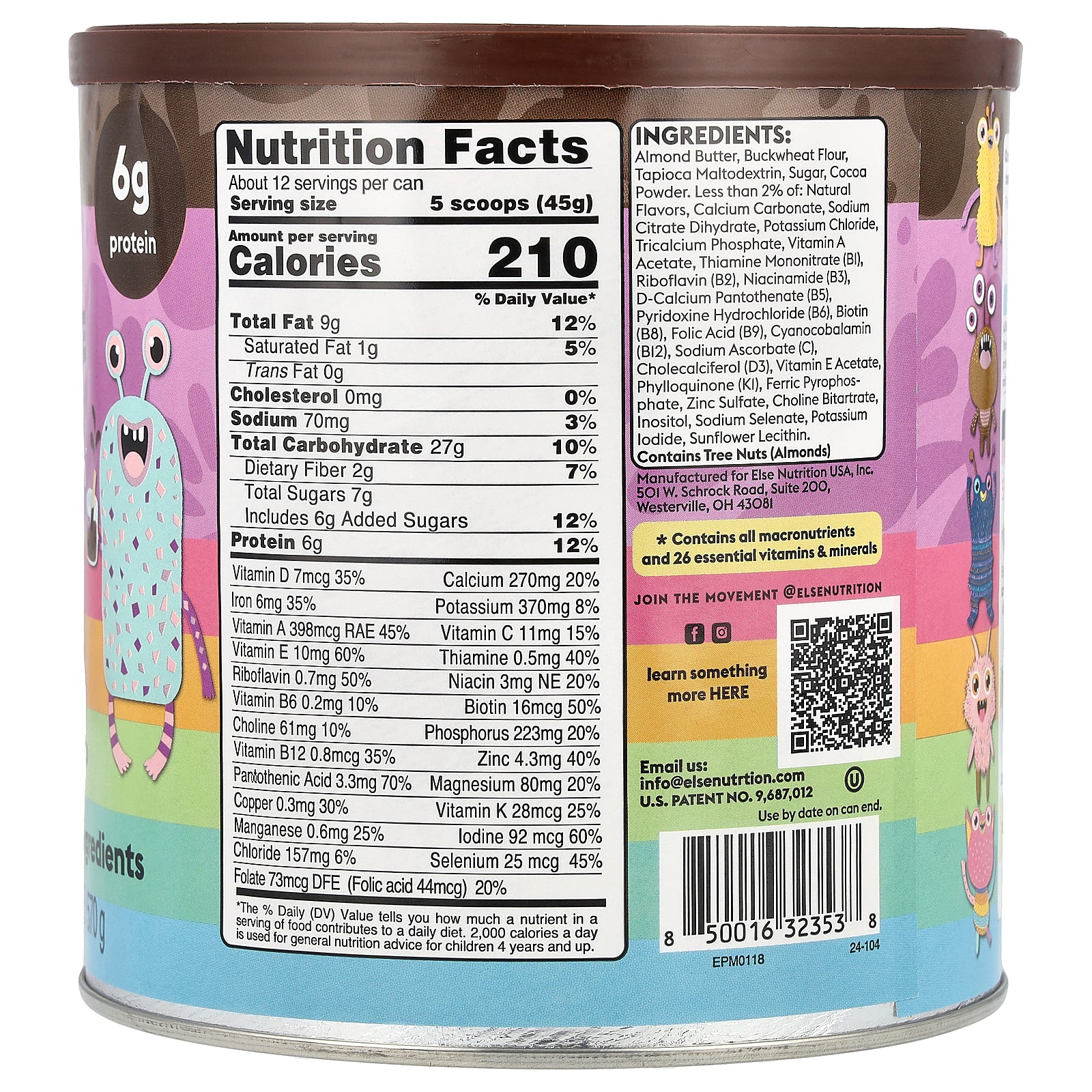 Almond butter, buckwheat flour, tapioca maltodextrin, sugar, cocoa powder. less than 2% of: natural flavors, calcium carbonate, sodium citrate dihydrate, potassium chloride, tricalcium phosphate, vitamin a acetate, thiamine mononitrate (bi), riboflavin (b2), niacinamide (b3), d-calcium pantothenate (b5), pyridoxine hydrochloride (b6), biotin (b8), folic acid (b9), cyanocobalamin (b12), sodium ascorbate (c), cholecalciferol (d3), vitamin e acetate, phylloquinone (ki), ferric pyrophosphate, zinc sulfate, choline bitartrate, inositol, sodium selenate, potassium iodide, sunflower lecithin.
