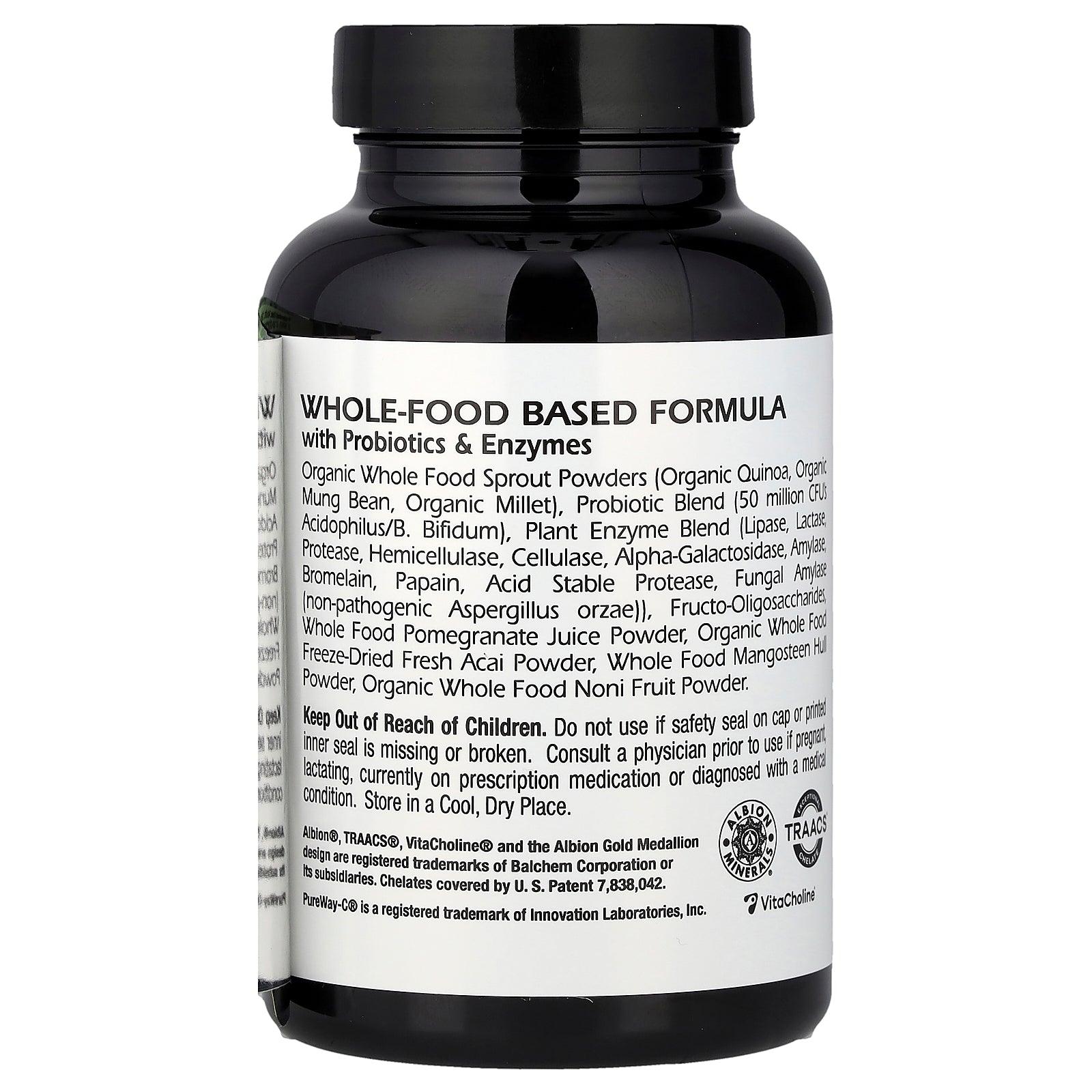 Whole Food Proprietary Blend Organic whole food sprout powders (organic quinoa, organic mung bean, organic millet), probiotic blend (50 million CFU's acidophilus/b. bifidum), plant enzyme blend (lipase, lactase, protease, hemicellulase, cellulase, alpha-galactosidase, amylase, bromelain, papain, acid-stable protease, fungal amylase (non-pathogenic aspergillus orzae)), fructo-oligosaccharides, whole food pomegranate juice powder, organic whole food freeze-dried fresh acai powder, whole food mangosteen hull powder, organic whole food noni fruit powder. |
