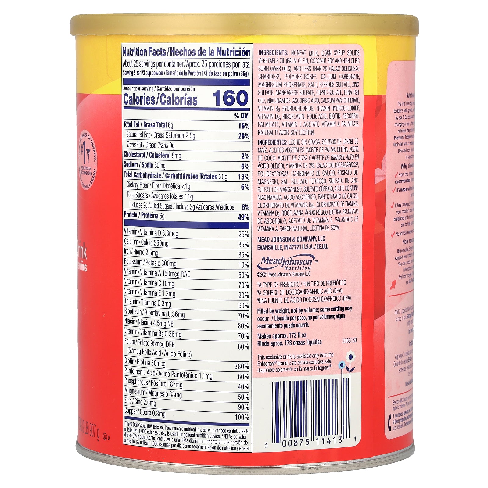 It has Omega-3 DHA and iron to help nourish your toddler's brain development, plus dual prebiotics and vitamins, including vitamin C, and zinc to help support immune health.
