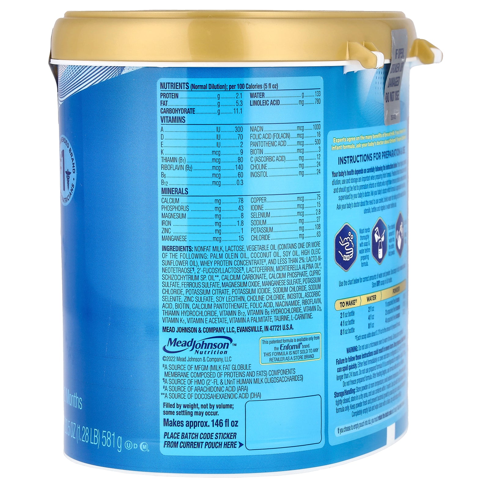 Nonfat milk, lactose, vegetable oil (contains one or more of the following: palm olein oil, coconut oil, soy oil, high oleic sunflower oil), whey protein concentrate", and less than 2%: lacto-n-neotetraose¶, 2'-fucosyllactose¶, lactoferrin, mortierella alpina oil#, schizochytrium sp. oil **, calcium carbonate, calcium phosphate, cupric sulfate, ferrous sulfate, magnesium oxide, manganese sulfate, potassium chloride, potassium citrate, potassium iodide, sodium chloride, sodium selenite, zinc sulfate, soy lecithin, choline chloride, inositol, ascorbic acid, biotin, calcium pantothenate, folic acid, niacinamide, riboflavin, thiamin hydrochloride, vitamin b12, vitamin b6 hydrochloride, vitamin d3, vitamin k1, vitamin e acetate, vitamin a palmitate, taurine, l-carnitine.