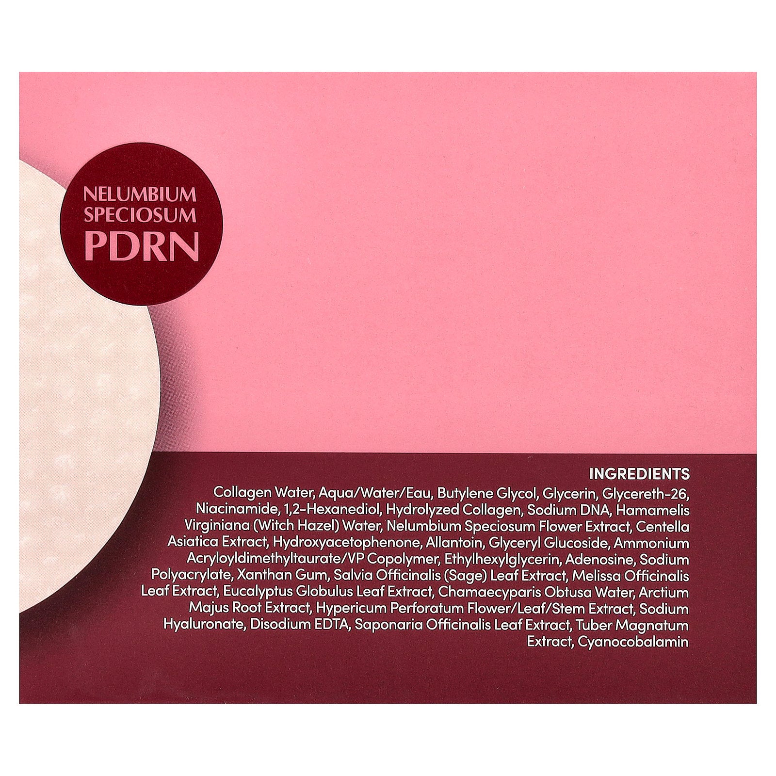 Collagen water, aqua/water/eau, butylene glycol, glycerin, glycereth-26, niacinamide, 1,2-hexanediol, hydrolyzed collagen, sodium dna, hamamelis virginiana (witch hazel) water, nelumbium speciosum flower extract, centella asiatica extract, hydroxyacetophenone, allantoin, glyceryl glucoside, ammonium acryloyldimethyltaurate/vp copolymer, ethylhexylglycerin, adenosine, sodium polyacrylate, xanthan gum, salvia officinalis (sage) leaf extract, melissa officinalis leaf extract, eucalyptus globulus leaf extract, chamaecyparis obtusa water, arctium majus root extract, hypericum perforatum flower/leaf/stem extract, sodium hyaluronate, disodium edta, saponaria officinalis leaf extract, tuber magnatum extract, cyanocobalamin.
