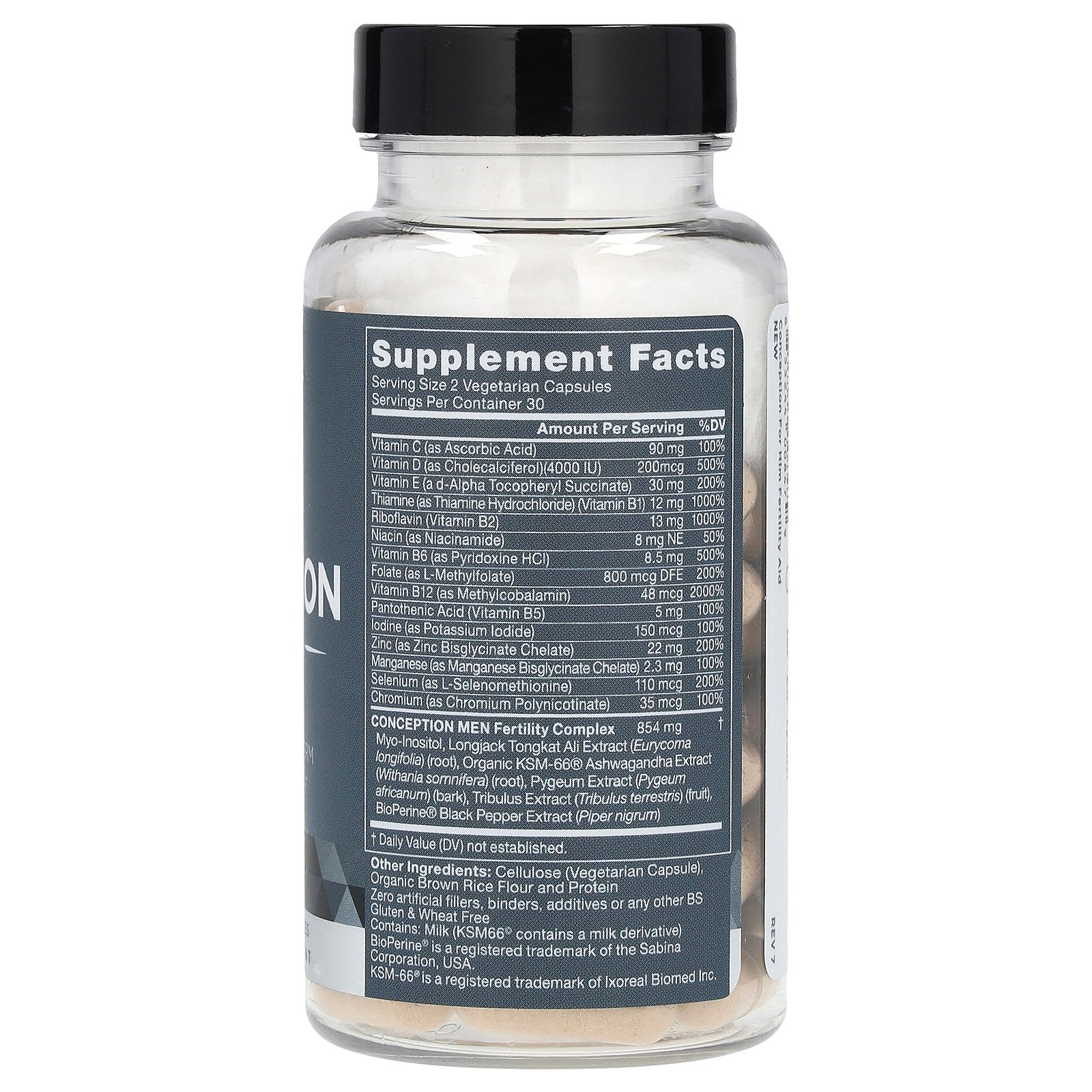Conception Men Fertility Complex Myo-Inositol, Longjack Tongkat Ali Extract (Eurycoma longifolia) (root), Organic KSM-66® Ashwagandha Extract (Withania somnifera) (root), Pygeum Extract (Pygeum africanum) (bark), Tribulus Extract (Tribulus terrestris) (fruit), BioPerine® Black Pepper Extract (Piper nigrum) |