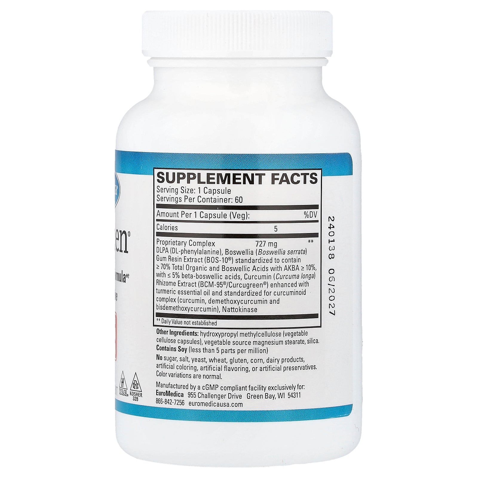 | Proprietary Complex DLPA (DL-phenylalanine), Boswellia (Boswellia serrata) Gum Resin Extract (BOS-10®) standardized to contain ≥ 70% Total Organic and Boswellic Acids with AKBA ≥ 10%, with ≤ 5% beta-boswellic acids, Curcumin (Curcuma longa) Rhizome Extract (BCM-95®/Curcugreen®) enhanced with turmeric essential oil and standardized for curcuminoid complex (curcumin, demethoxycurcumin and bisdemethoxycurcumin), Nattokinase |