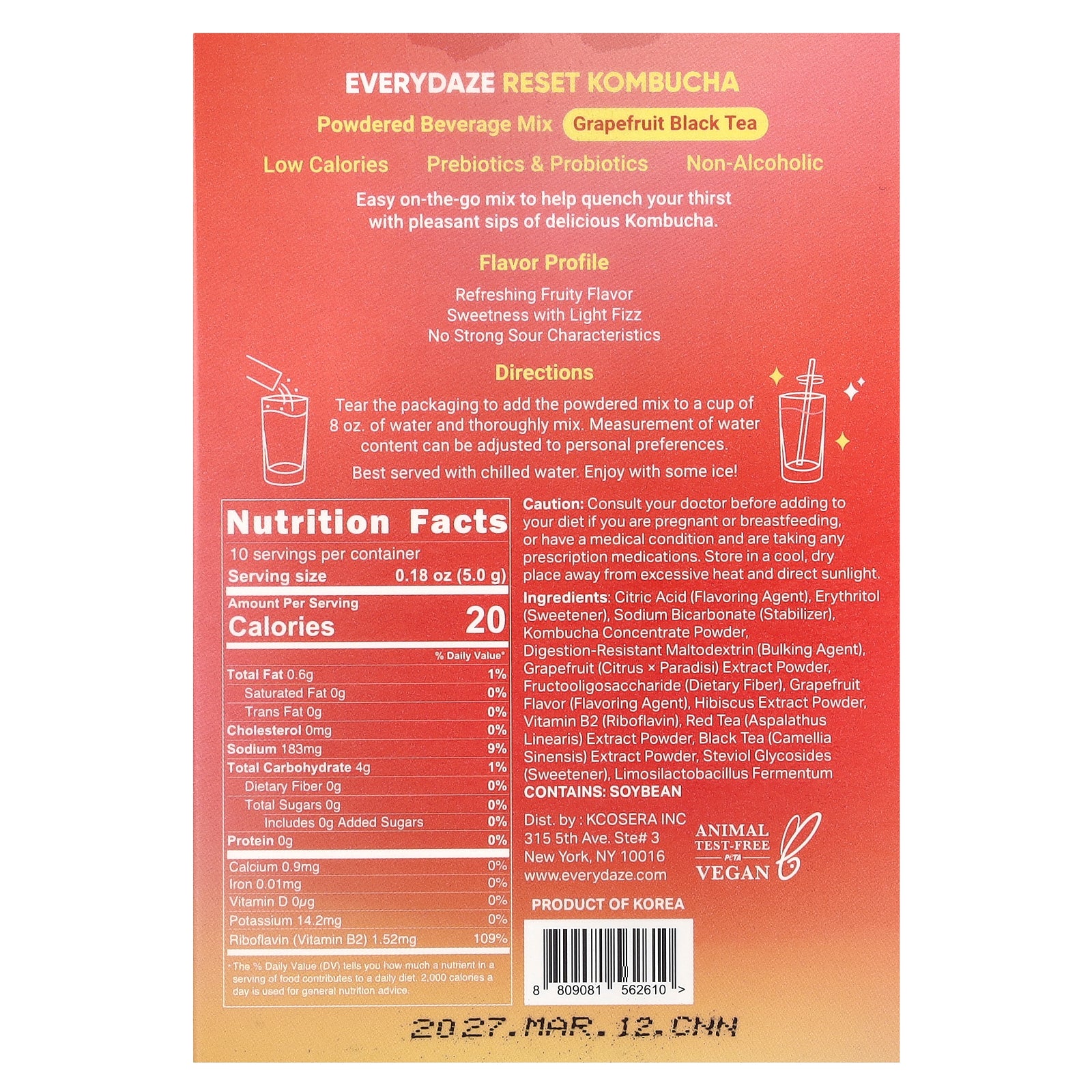 Citric acid (flavoring agent), erythritol (sweetener), sodium bicarbonate (stabilizer), kombucha concentrate powder, digestion-resistant maltodextrin (bulking agent), grapefruit (citrus × paradisi) extract powder, fructooligosaccharide (dietary fiber), grapefruit flavor (flavoring agent), hibiscus extract powder, vitamin b2 (riboflavin), red tea (aspalathus linearis) extract powder, black tea (camellia sinensis) extract powder, steviol glycosides (sweetener), limosilactobacillus fermentum.