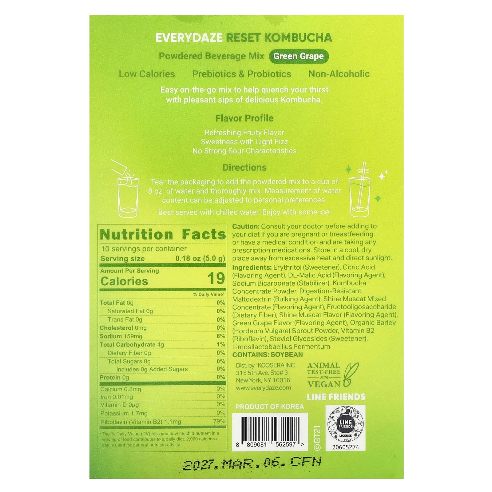 Erythritol (sweetener), citric acid (flavoring agent), dl-malic acid (flavoring agent), sodium bicarbonate (stabilizer), kombucha concentrate powder, digestion-resistant maltodextrin (bulking agent), shine muscat mixed concentrate (flavoring agent), fructooligosaccharide (dietary fiber), shine muscat flavor (flavoring agent), green grape flavor (flavoring agent), organic barley (hordeum vulgare) sprout powder, vitamin b2 (riboflavin), steviol glycosides (sweetener), limosilactobacillus fermentum.