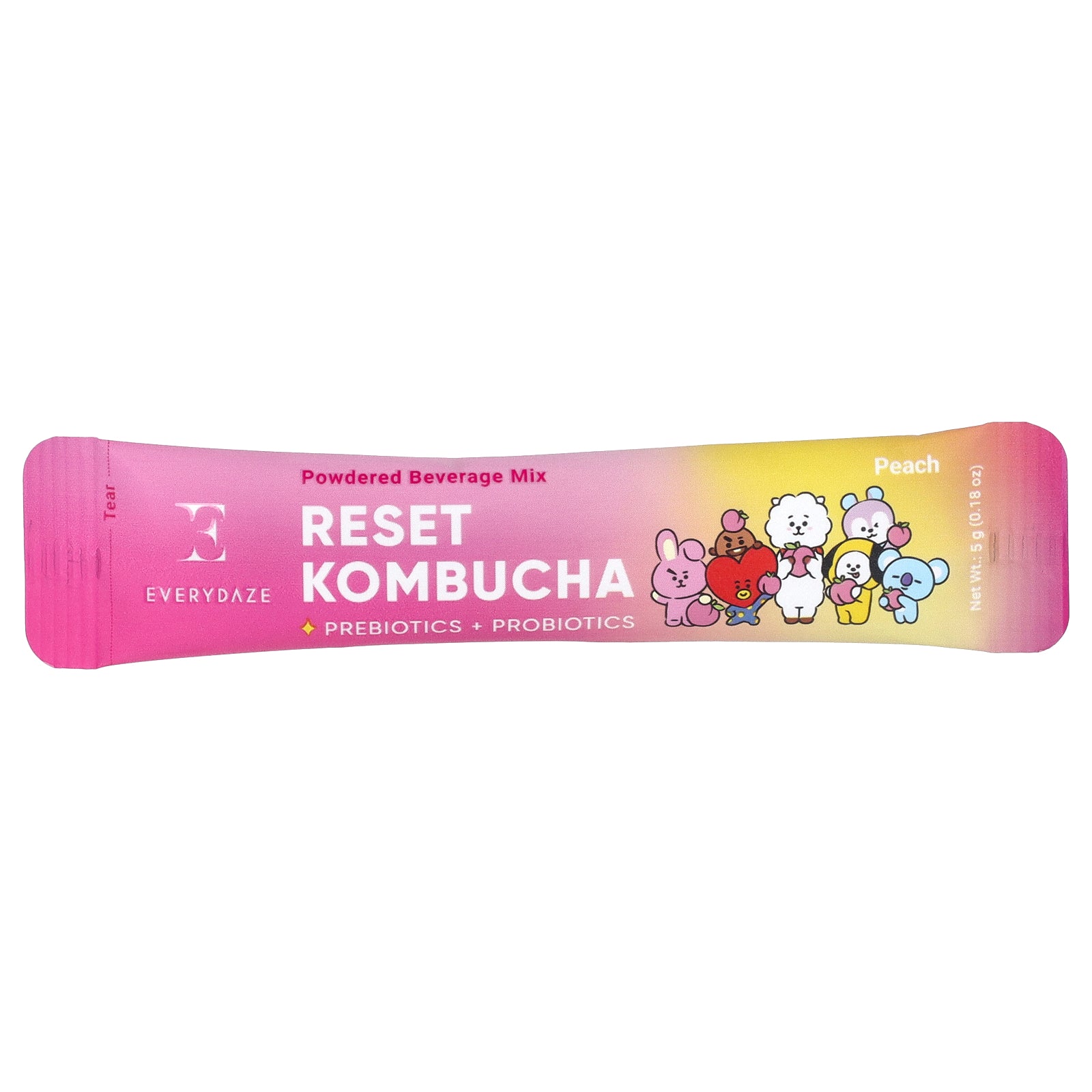 Citric acid (flavoring agent) erythritol (sweetener), sodium bicarbonate (stabilizer), kombucha concentrate powder digestion-resistant maltodextrin (bulking agent), fructooligosaccharide (dietary fiber) peach flavor (flavoring agent), peach concentrate powder (flavoring agent) hibiscus extract powder, black tea (camellia sinensis) extract powder, steviol glycosides sweetener), limosilactobacillus fermentum.