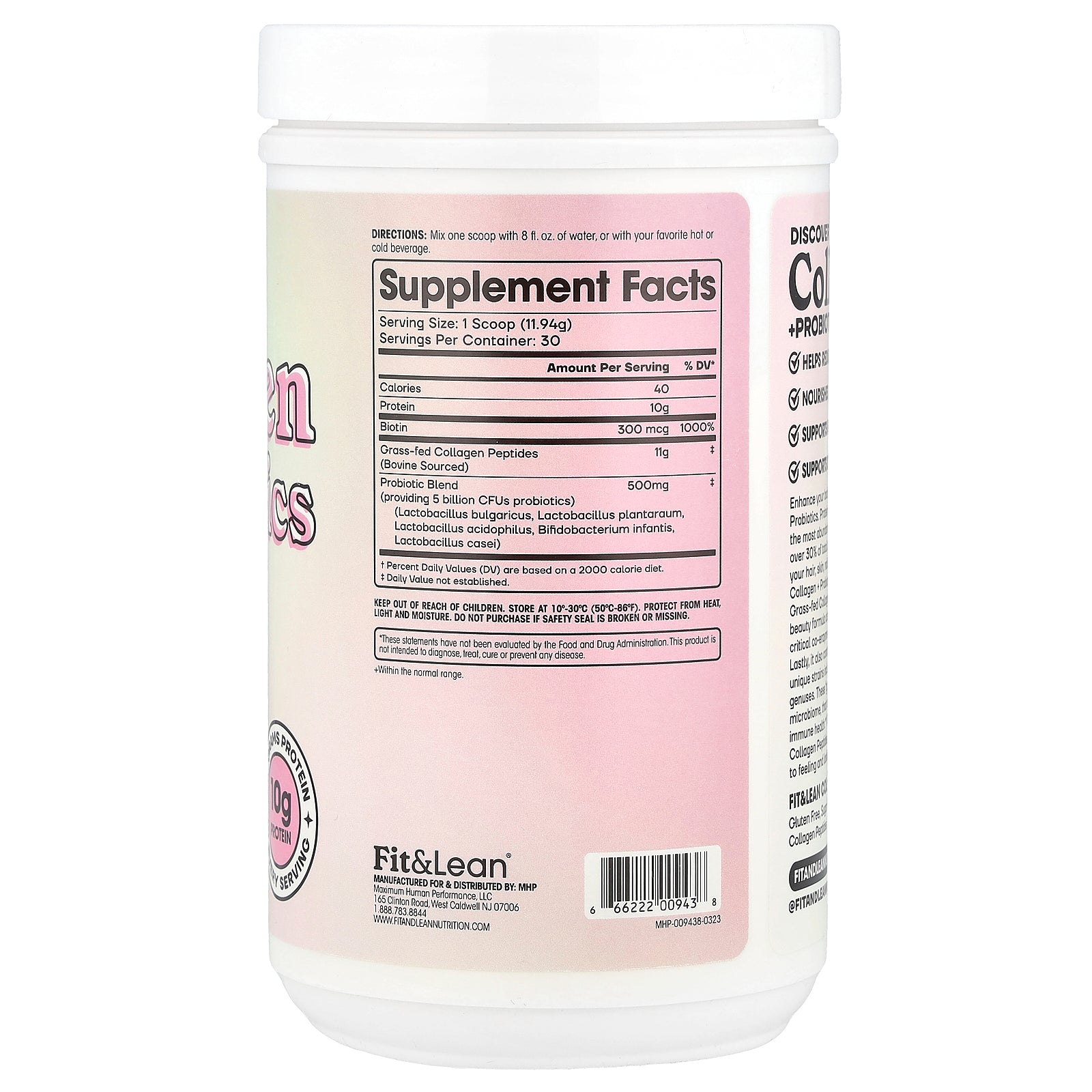 Enhance your body and beauty with Fit&Lean® Collagen+ Probiotics. Protein is the foundation of a healthy body, and the most abundant protein in the body is collagen, making up over 30% of total body proteins. Collagen can be found in your hair, skin, nails, muscles, bones and joints. Fit&Lean Collagen + Probiotics features 11 grams of the highest quality, Grass-fed Collagen Peptides. Plus this advanced body and beauty formula also contains 1000% daily value of Biotin, a critical co-enzyme to support and nourish hair, skin and nails. Lastly, it also contains 5 Billion CFUs of probiotics, from 5 unique strains including Lactobacillus and Bifidobacterium genuses. These "good bacteria" can help you build a healthy microbiome, that can promote better digestion, regularity and immune health. With this powerful combination of Grass-fed Collagen Peptides, biotin and probiotics, you'll be on your way to feeling and looking beautiful and fit!