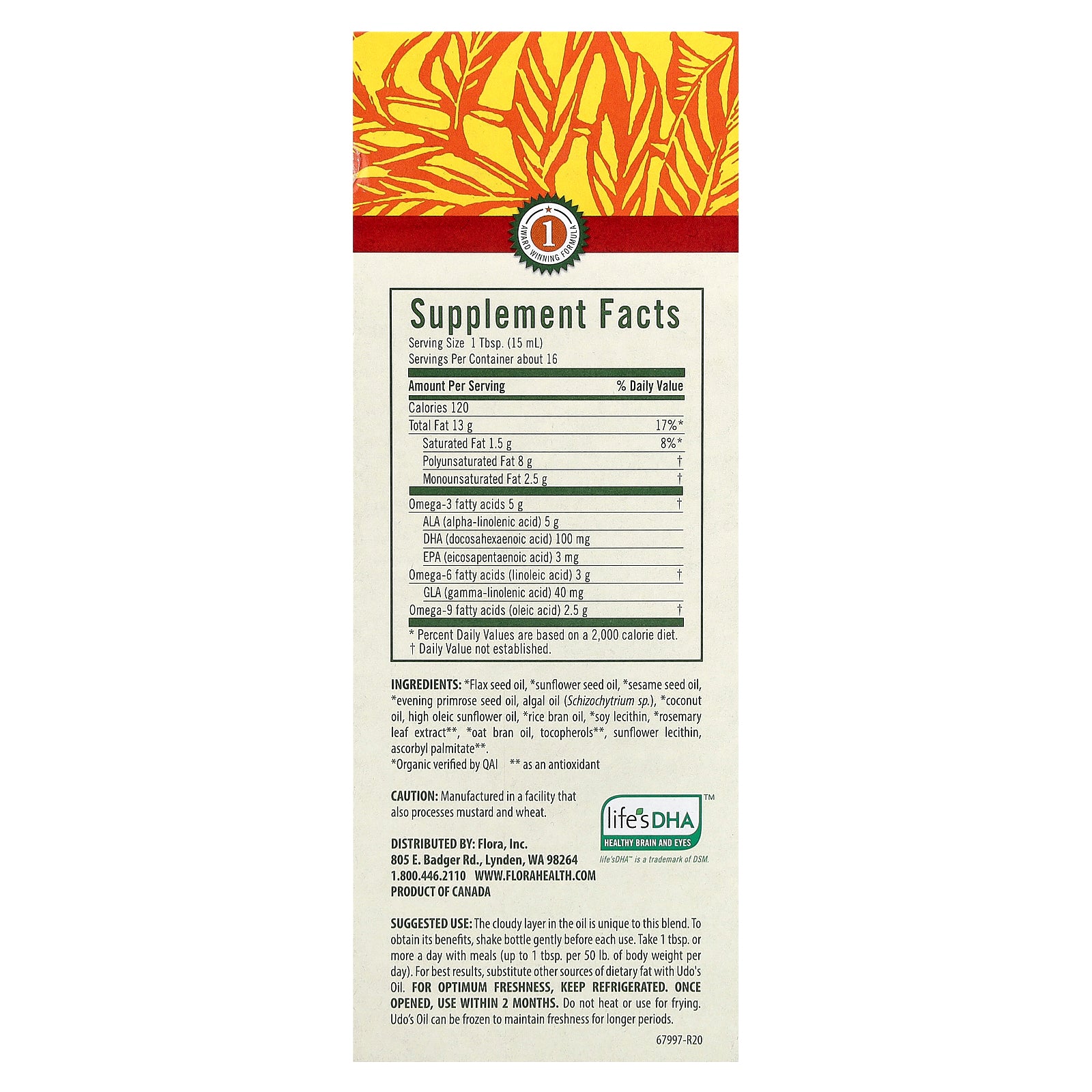 The cloudy layer in the oil is unique to this blend. To obtain its benefits, shake bottle gently before each use. Take 1 tbsp. or more a day with meals (up to 1 tbsp. per 50 lb. of body weight per day). For best results, substitute other sources of dietary fat with Udo's Oil. For optimum freshness, keep refrigerated. Once opened, use within 2 months.