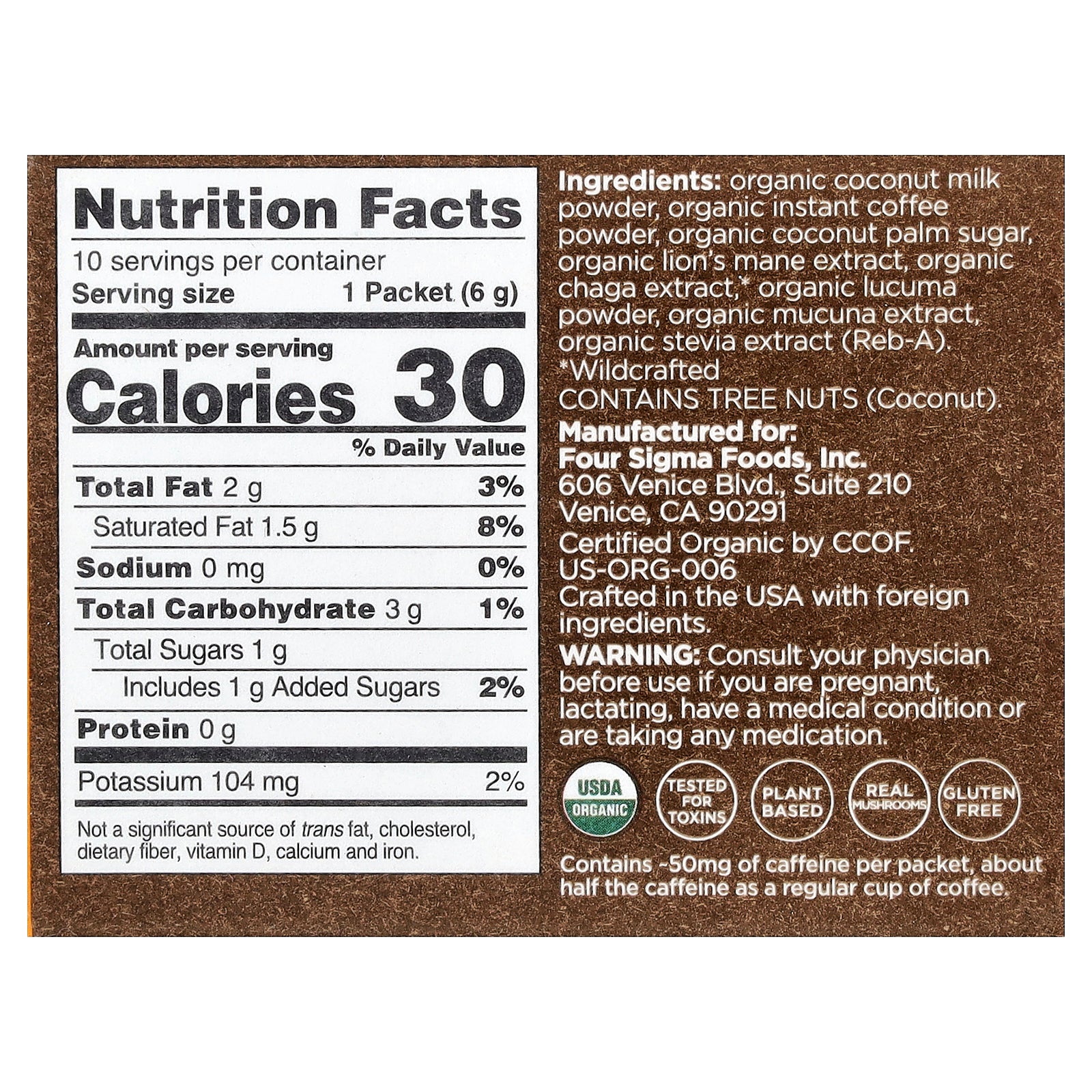 Organic coconut milk powder, organic instant coffee powder, organic coconut palm sugar, organic lion's mane extract, organic chaga extract*, organic lucuma powder, organic mucuna extract, organic stevia extract (reb-A).