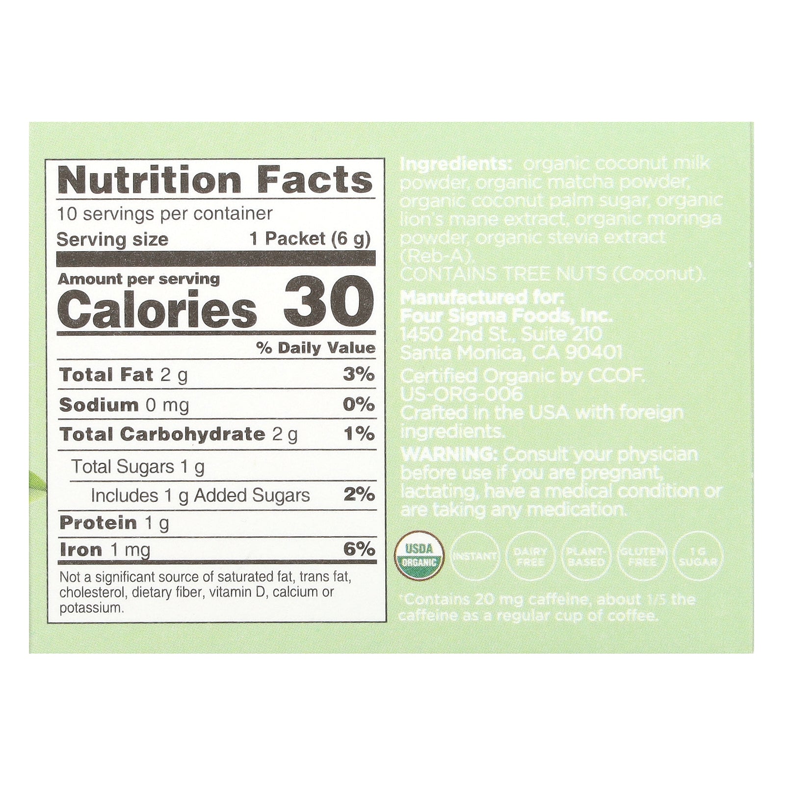 Organic coconut milk powder, organic matcha powder, organic coconut palm sugar, organic lion's mane extract (500 mg), organic moringa powder, organic stevia extract (reb-A).