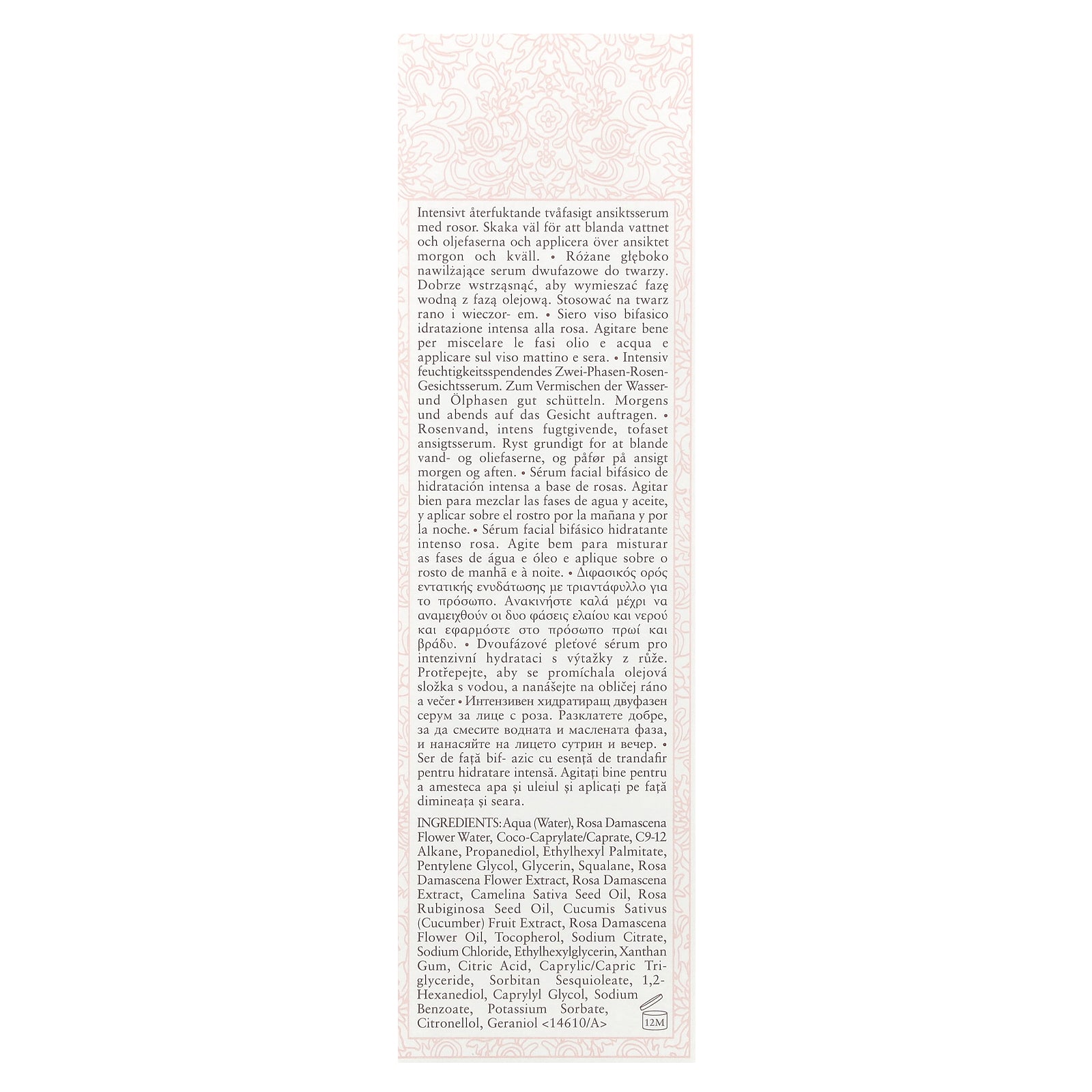 Water, rosa damascena flower water, coco-caprylate/caprate, c9-12 alkane, propanediol, ethylhexyl palmitate, pentylene glycol, glycerin, squalane, rosa damascena flower extract, rosa damascena extract, camelina sativa seed oil, rosa rubiginosa seed oil, cucumis sativus (cucumber) fruit extract, rosa damascena flower oil, tocopherol, sodium citrate, sodium chloride, ethylhexylglycerin, xanthan gum, citric acid, caprylic/capric triglyceride, sorbitan sesquioleate, 1,2- hexanediol, caprylyl glycol, sodium benzoate, potassium sorbate, citronellol, geraniol.
