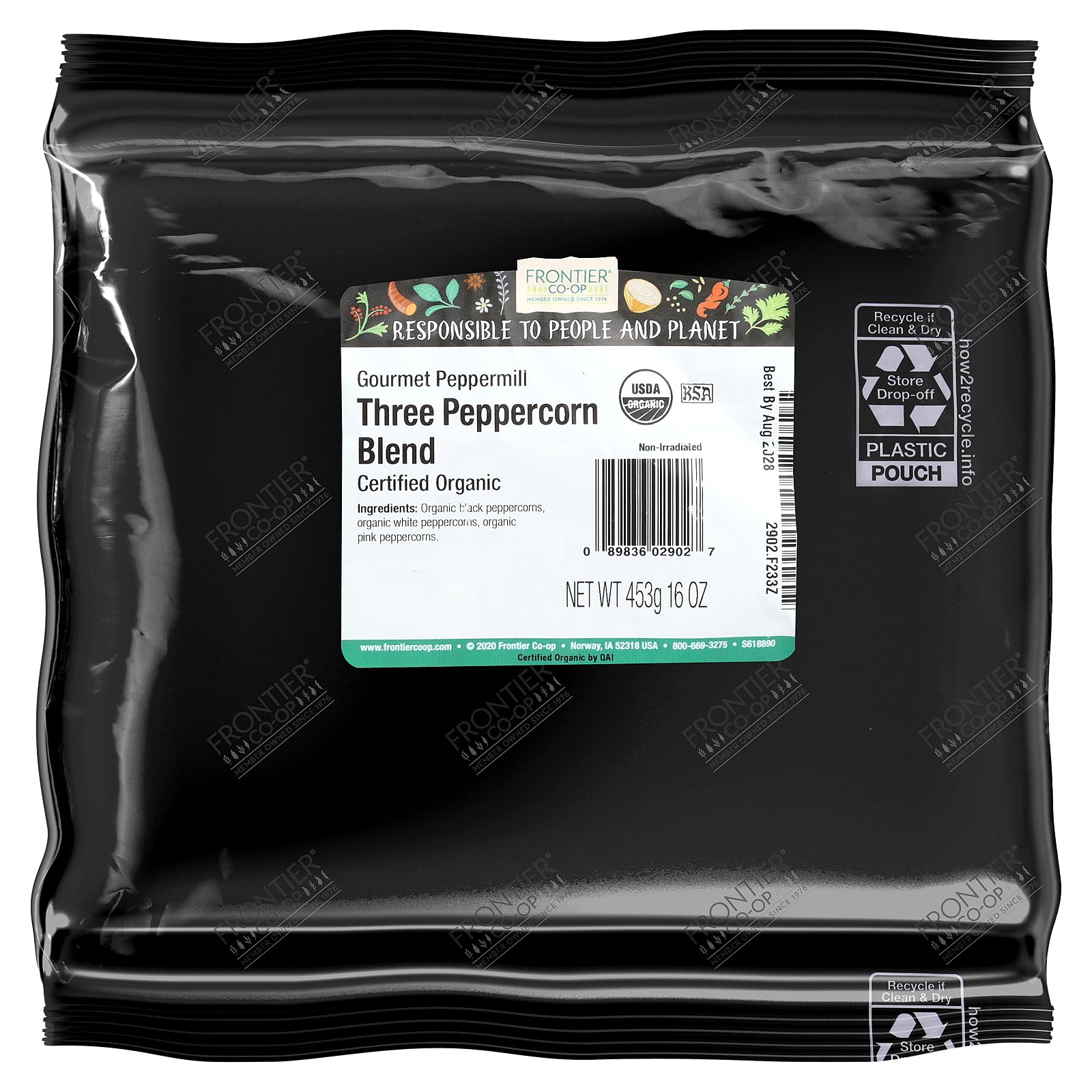 A gourmet blend of organic black, white and pink peppercorns, Frontier Co-op® Organic 3-Pepper Peppermill Blend adds a colorful burst of flavor that's milder than all-black peppercorns. Adds a beautiful gourmet touch to your table when placed in a clear peppermill. For pungent, peppery flavor in any dish, simply grind a few peppercorns during cooking or at the table.