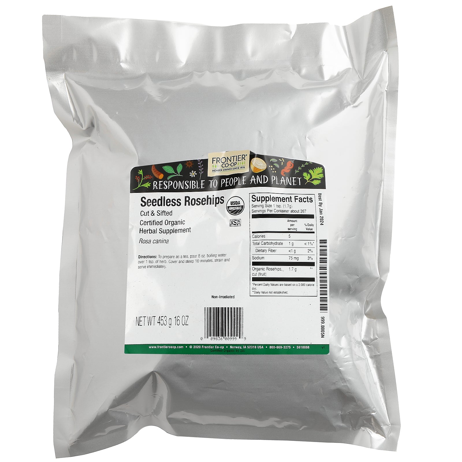ROSEHIPS - Frontier Co-op Organic Seedless Rosehips (Rosa canina), are also called rose haw or rose hep. These fruits are commonly used in syrups, jellies, jams, beverages, teas, and bread. They're widely available in various forms such as whole and powdered.