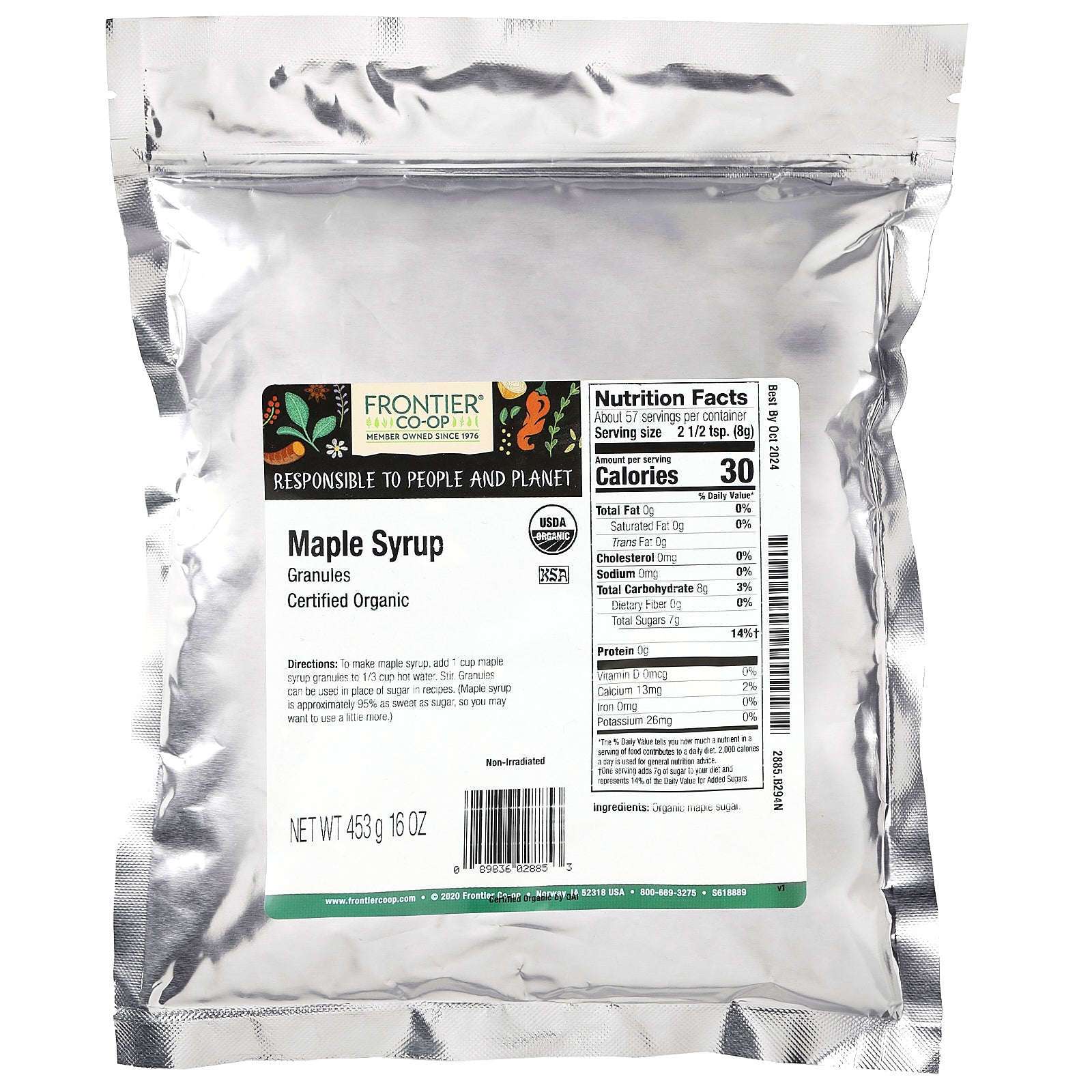 Frontier Co-op Maple Syrup comes in granule and powder form and can be used as a replacement for sugar, maple flavor or maple syrup. It is made of pure, dehydrated maple syrup with no additives or preservatives. Add granules or powder to hot drinks like cocoa or milk toddies or in baked goods or trail mixes.