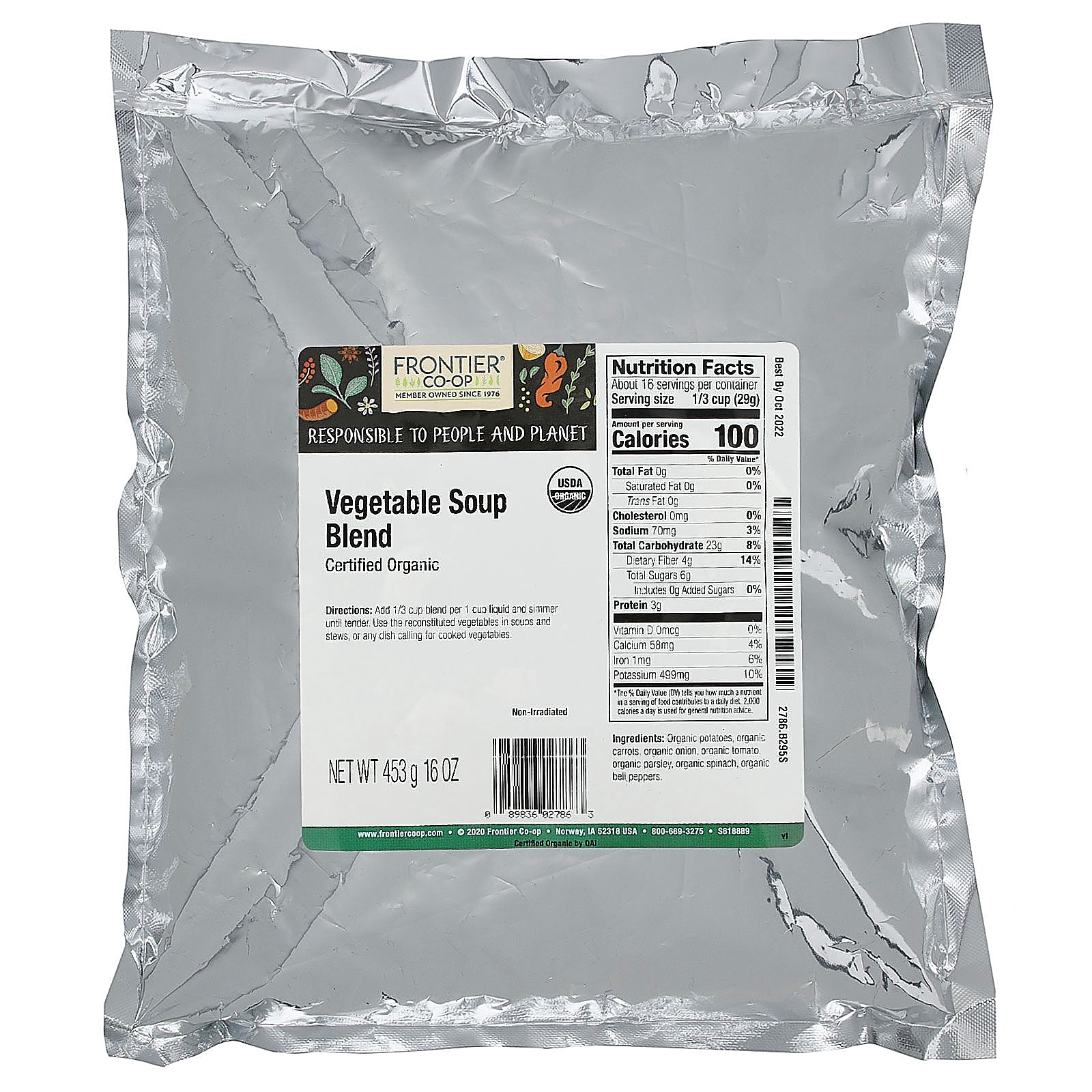VEGETABLE SOUP BLEND - The Frontier Co-op Organic Vegetable Soup Blend is a flavorful combination of vegetables including onions, carrots, tomatoes and potatoes that goes well with soups, stews and prepared dishes that require vegetables.