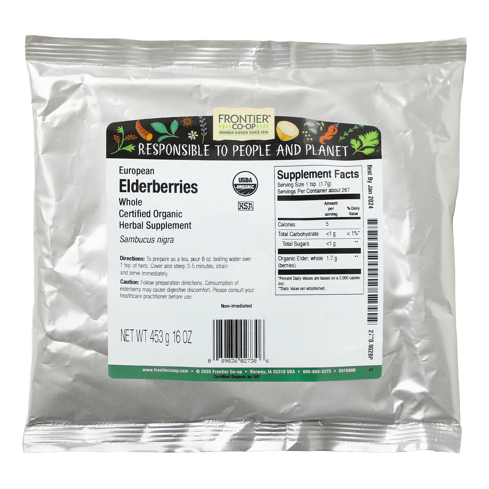 DRIED ELDERBERRIES - Frontier Co-op Organic Elderberries (botanical name: Sambucus nigra) are part of the honeysuckle family. They are attractive, dark berries that are used to make jams, syrups, juices, and wine. They are often part of sweet treats, too - such as pies, crumbles, and more. Elderberries are traditionally used to support a healthy immune system.