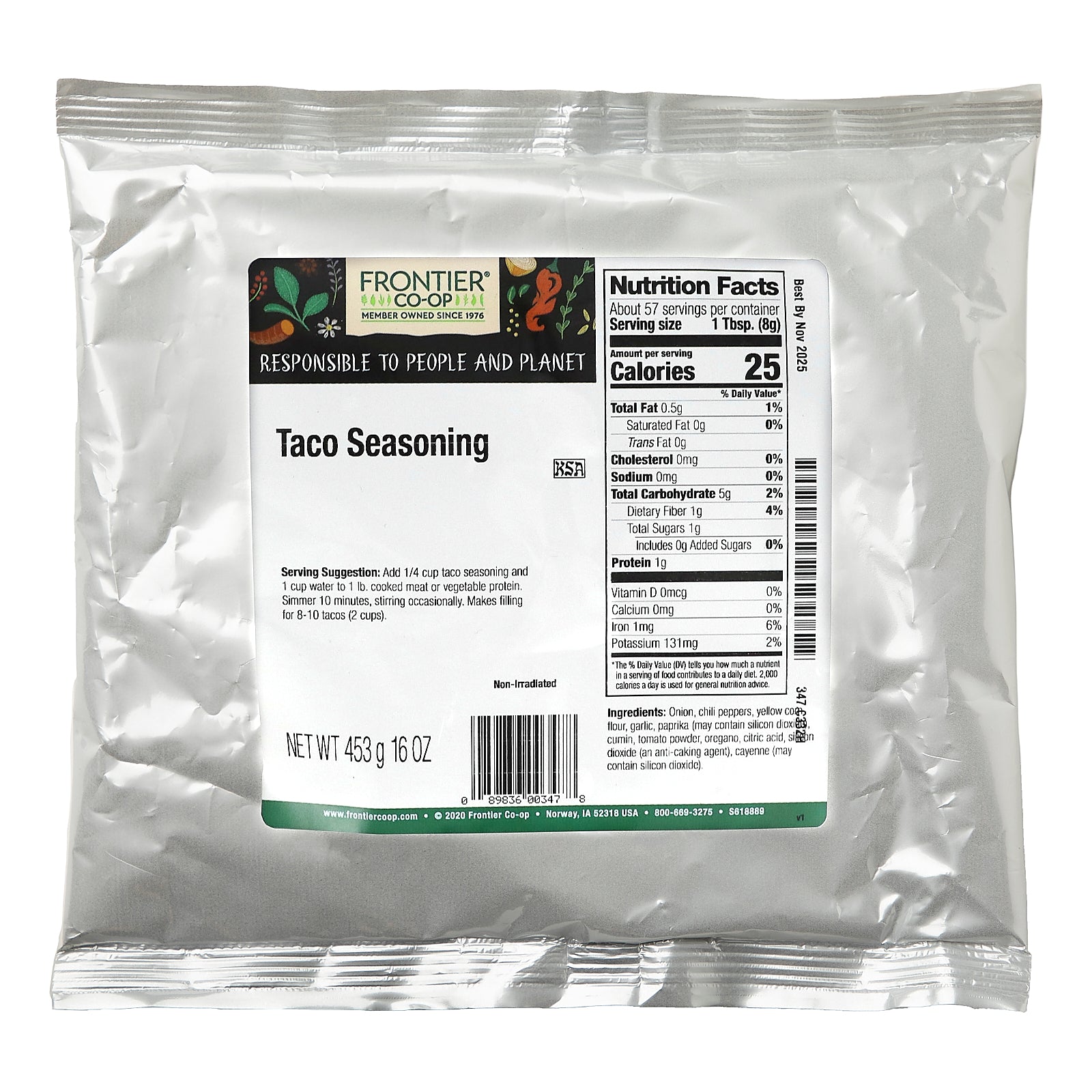 Add instant south-of-the-border taco flavor to any fare with Frontier® Co-op Taco Seasoning. This zesty blend of robust spices is perfect for adding authentic taco taste to browned meat, rice, beans and dip. Start with just a pinch or two and add more to taste. Our bulk taco seasoning is kosher certified and non-irradiated.