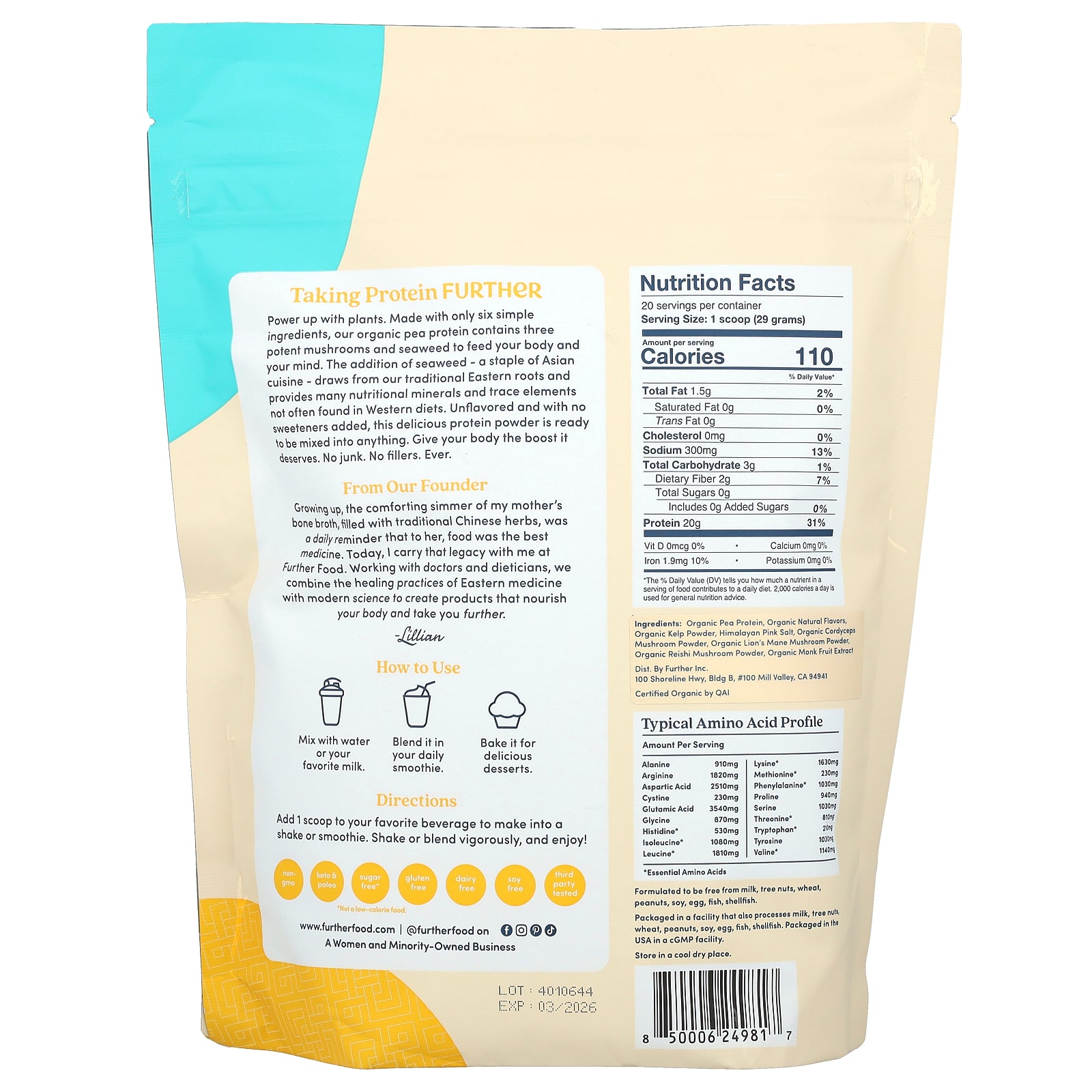 Power up with plants. Made with only six simple ingredients, our organic pea protein contains three potent mushrooms and seaweed to feed your body and your mind. The addition of seaweed - a staple of Asian cuisine - draws from our traditional Eastern roots and provides many nutritional minerals and trace elements not often found in Western diets. Unflavored and with no sweeteners added, this delicious protein powder is ready to be mixed into anything. Give your body the boost it deserves. No junk. No fillers. Ever.