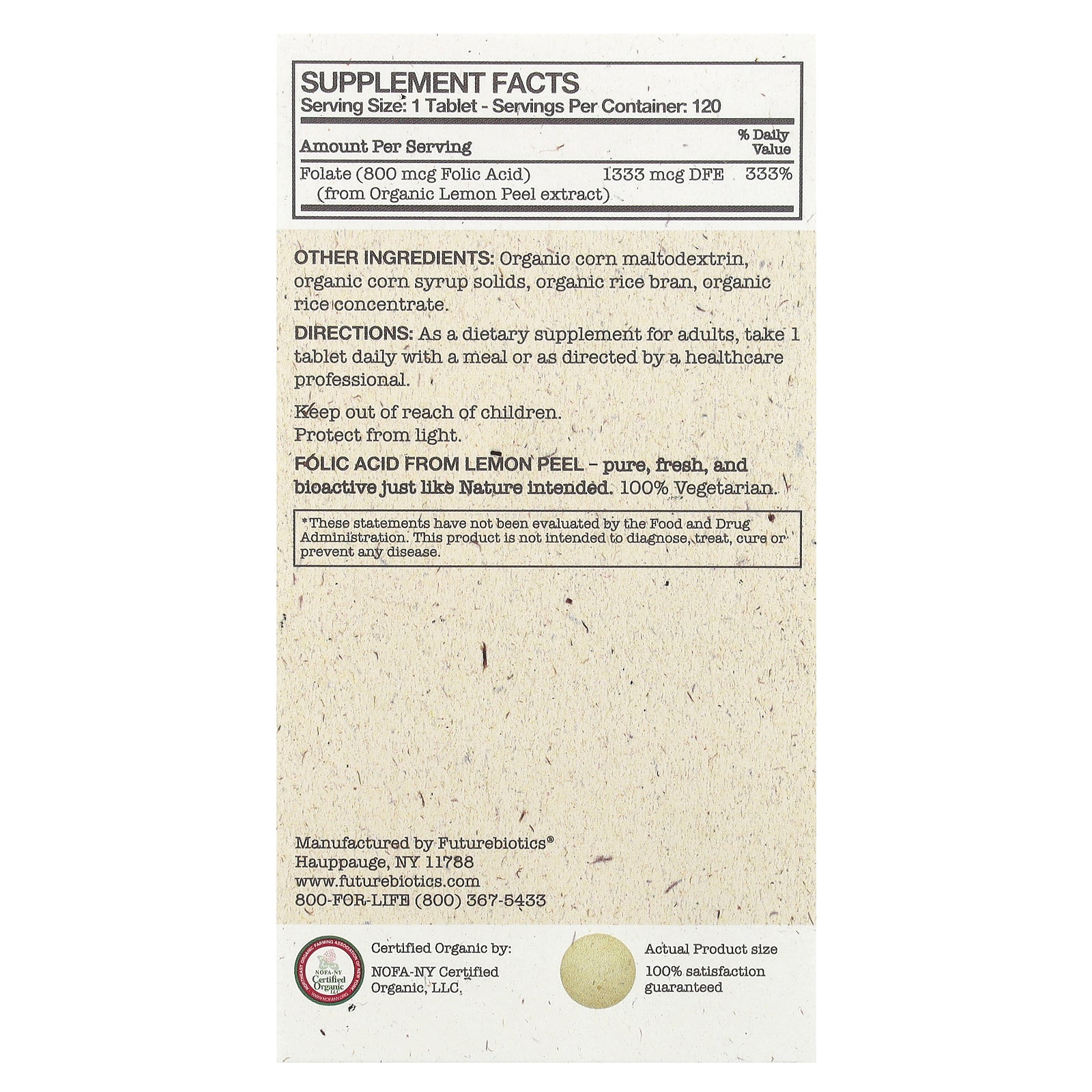 Futurebiotics® Folic Acid utilizes only certified organic whole lemon peel extract. Lemons are grown on an organic farm without chemical pesticides or fertilizers and water extracted to maintain purity. In addition to the folic acid, the extract provides bioflavonoids naturally present in lemon peel.