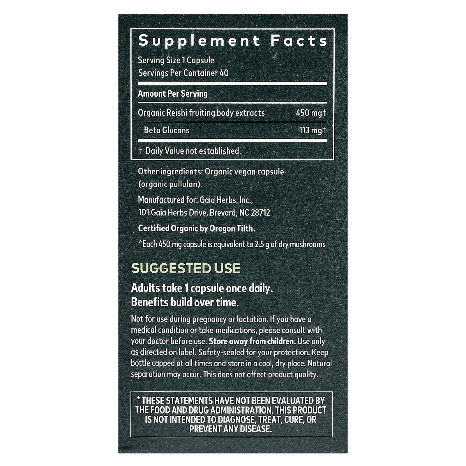 | Organic Reishi fruiting body extracts | 450 mg | † |