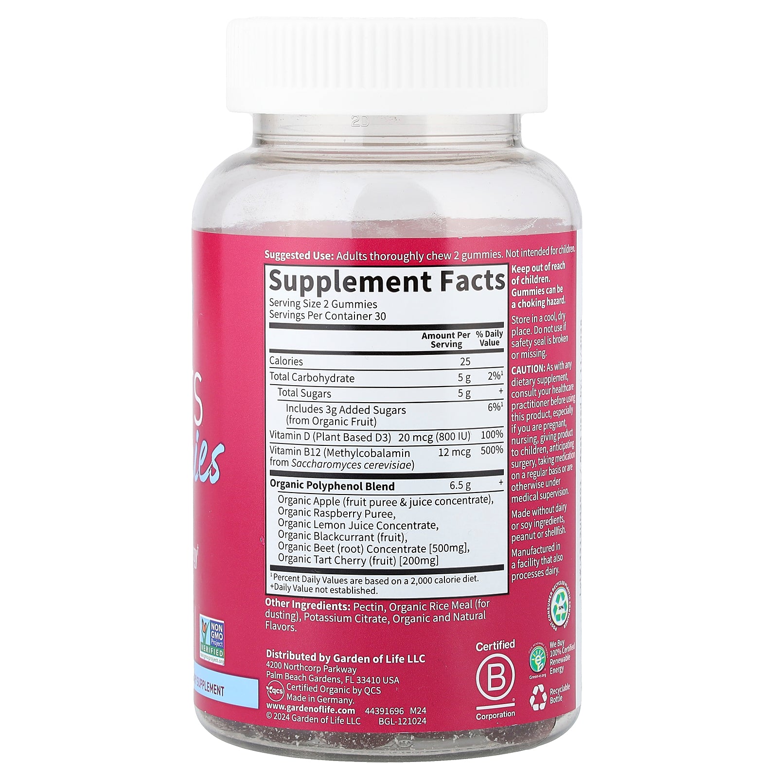 Organic Polyphenol Blend Organic Apple (Fruit Puree & Juice Concentrate), Organic Raspberry Puree, Organic Lemon Juice Concentrate, Organic Blackcurrant (Fruit), Organic Beet (Root) Concentrate [500 mg], Organic Tart Cherry (fruit)[200 mg] |