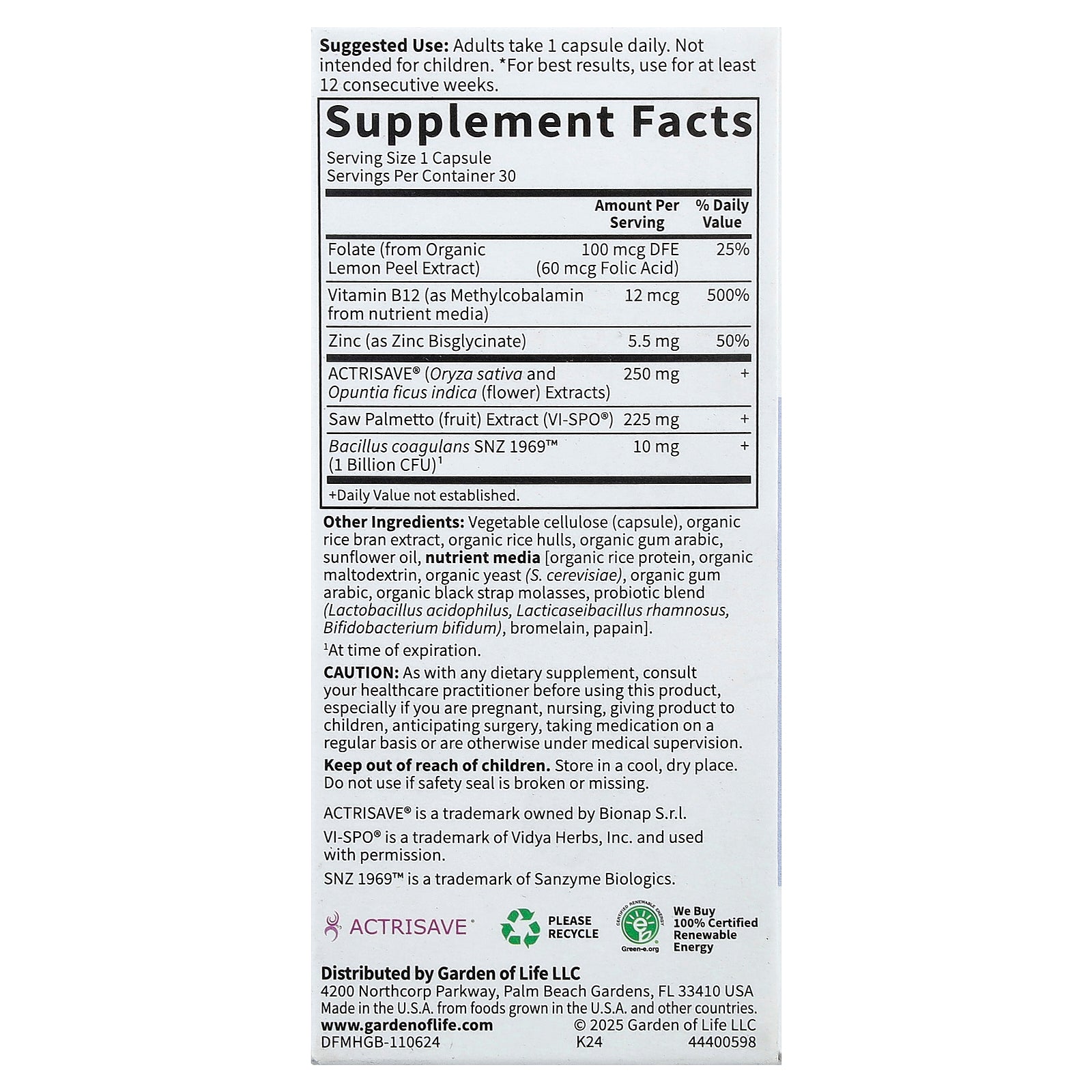 Vegetable cellulose (capsule), organic rice bran extract, organic rice hulls, organic gum arabic, sunflower oil, nutrient media [organic rice protein, organic maltodextrin, organic yeast (S. cerevisiae), organic gum arabic, organic black strap molasses, probiotic blend (Lactobacillus acidophilus, Lacticaseibacillus rhamnosus, Bifidobacterium bifidum), bromelain, papain].