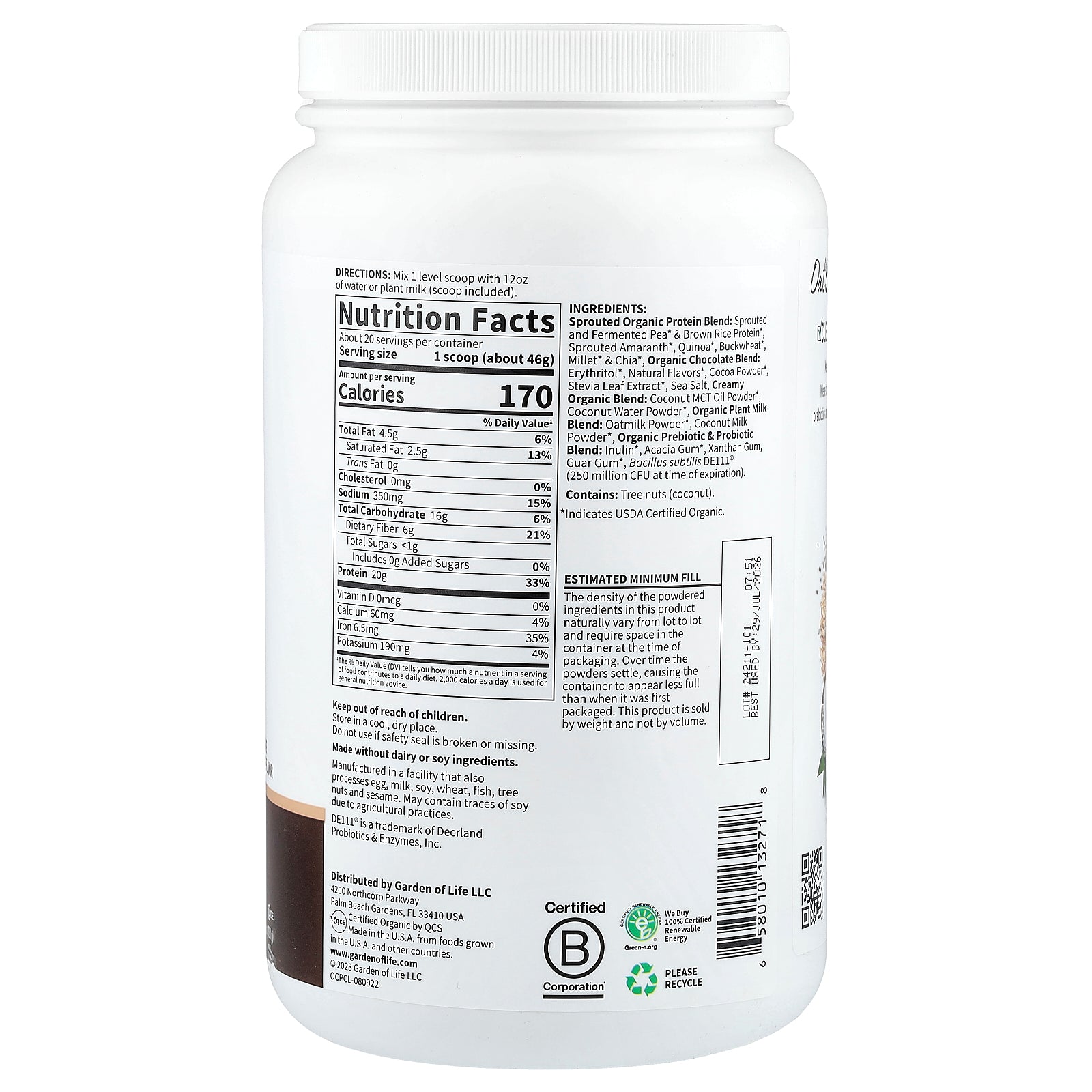 Sprouted organic protein blend: sprouted and fermented pea* & brown rice protein*, sprouted amaranth*, quinoa*, buckwheat*, millet* & chia*, organic chocolate blend: erythritol*, natural flavors*, cocoa powder*, stevia leaf extract*, sea salt, creamy organic blend: coconut MCT oil powder*, coconut water powder*, organic plant milk blend: oatmilk powder*, coconut milk powder*, organic prebiotic & probiotic blend: inulin*, acacia gum*, xanthan gum, guar gum*, bacillus subtilis DE111® (250 million CFU at time of expiration).