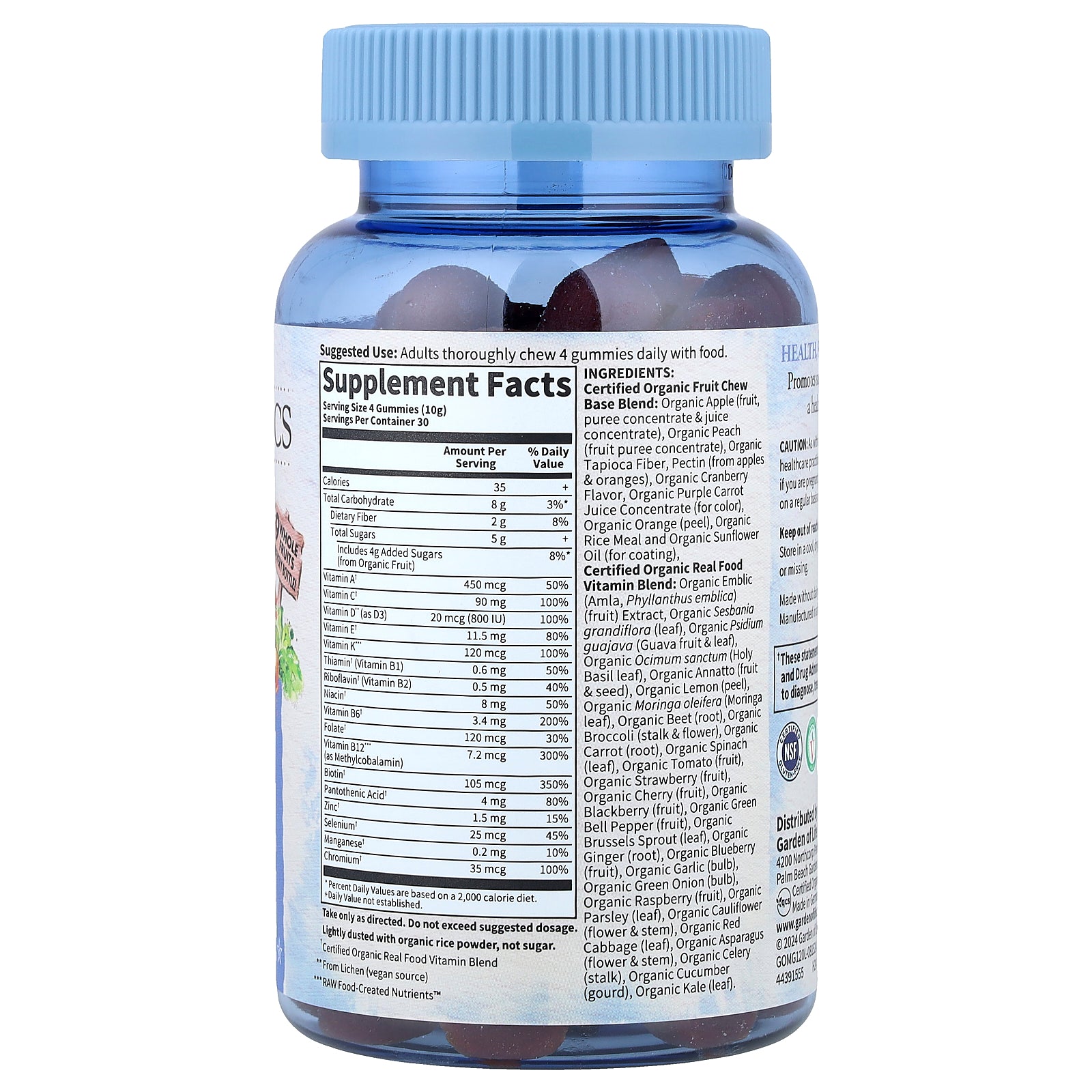 Certified Organic Fruit Chew Base Blend: Organic apple (fruit, puree concentrate & juice concentrate), organic peach (fruit puree concentrate), organic tapioca fiber, pectin (from apples & oranges), organic cranberry flavor, organic purple carrot juice concentrate (for color), organic orange (peel), organic rice meal and organic sunflower oil (for coating), Certified Organic Real Food Vitamin Blend: Organic emblic (amla, phyllanthus emblica) (fruit) extract, organic sesbania grandiflora (leaf), organic psidium guajava (guava fruit & leaf), organic ocimum sanctum (holy basil leaf), organic annatto (fruit & seed), organic lemon (peel), organic moringa oleifera (moringa leaf), organic beet (root), organic broccoli (stalk & flower), organic carrot (root), organic spinach (leaf), organic tomato (fruit), organic strawberry (fruit), organic cherry (fruit), organic blackberry (fruit), organic green bell pepper (fruit), organic brussels sprout (leaf), organic ginger (root), organic blueberry (fruit), organic garlic (bulb), organic green onion (bulb), organic raspberry (fruit), organic parsley (leaf), organic cauliflower (flower & stem), organic red cabbage (leaf), organic asparagus flower & stem), organic celery stalk), organic cucumber (gourd), organic kale (leaf).