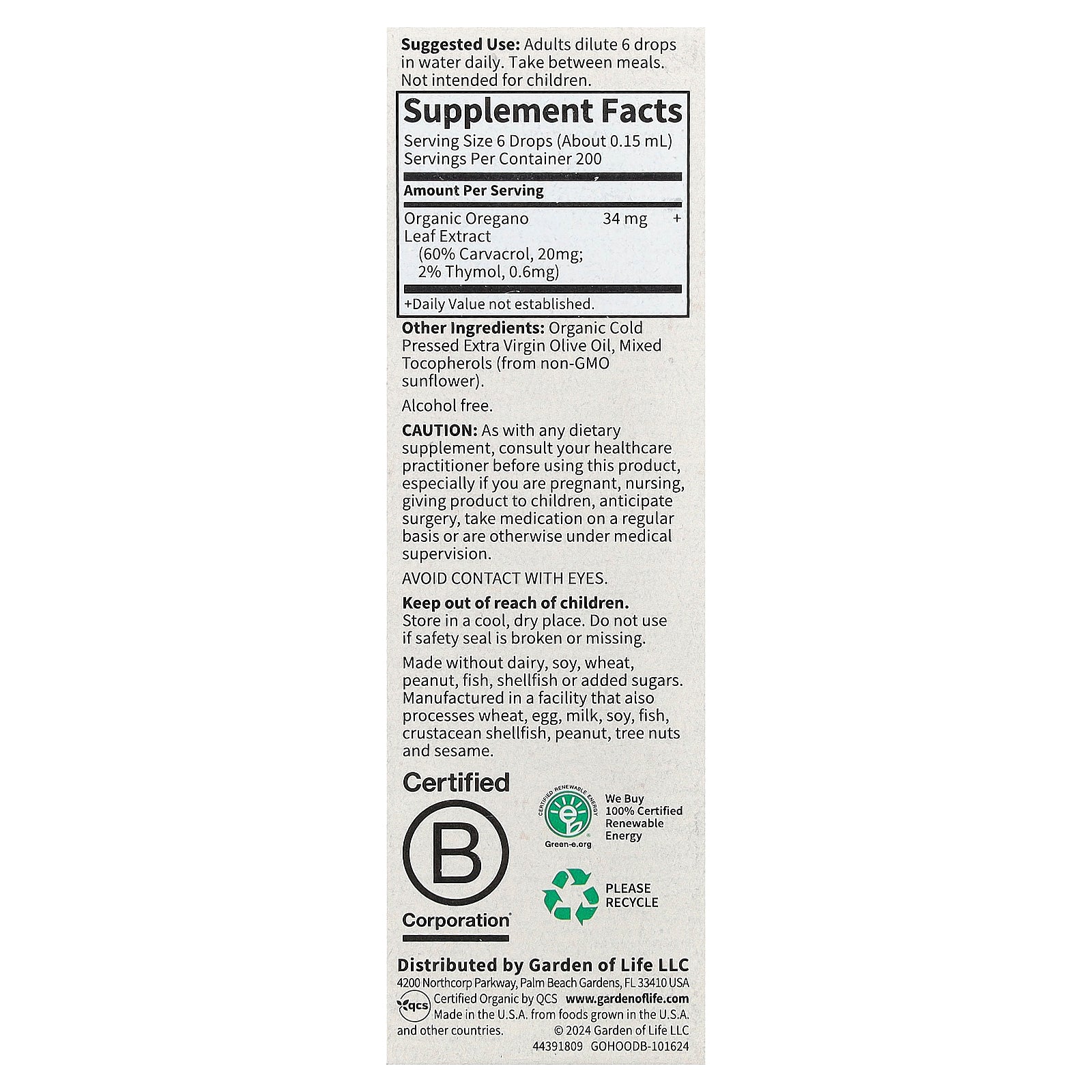| Organic Oregano Leaf Extract (60% Carvacrol, 20 mg; 2% Thymol, 0.6 mg) |