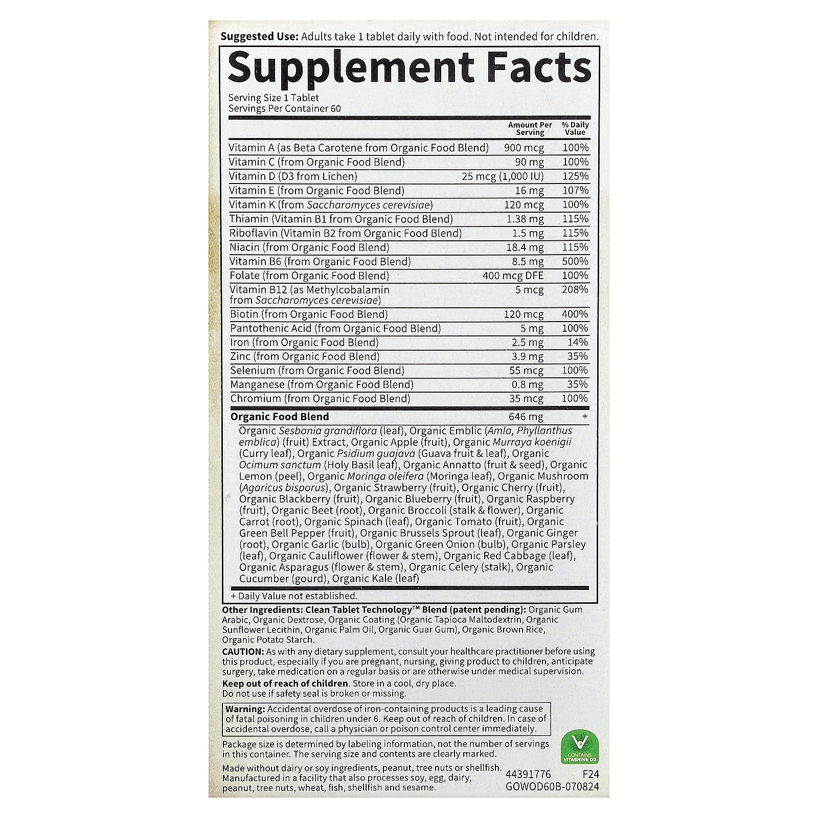 | Folate (from Organic Food Blend) | 400 mcg DFE | 100% |