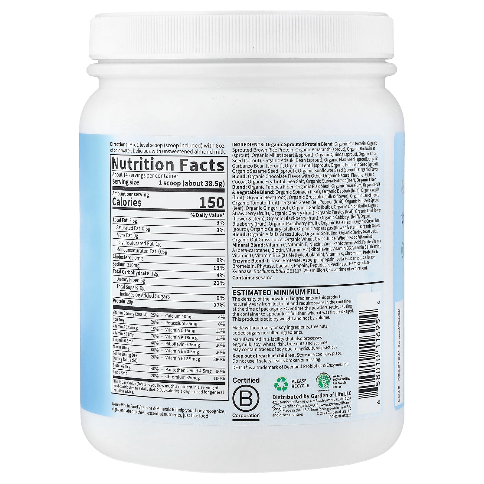 Organic sprouted protein blend: organic pea protein, organic sprouted brown rice protein, organic amaranth (sprout), organic buckwheat (sprout), organic millet (pearl & sprout), organic quinoa (sprout), organic chia seed (sprout), organic adzuki bean (sprout), organic flax seed (sprout), organic garbanzo bean (sprout), organic lentil (sprout), organic pumpkin seed (sprout), organic sesame seed (sprout), organic sunflower seed (sprout), organic flavor blend: organic chocolate flavor with other organic natural flavors, organic cocoa, organic erythritol, sea salt, organic stevia extract (leaf), organic fiber blend: organic tapioca fiber, organic flax meal, organic guar gum, organic fruit & vegetable blend: organic spinach (leaf), organic baobab (fruit), organic apple (fruit), organic beet (root), organic broccoli (stalk & flower), organic carrot (root), organic tomato (fruit), organic green bell pepper (fruit), organic brussels sprout (leaf), organic ginger (root), organic garlic (bulb), organic onion (bulb), organic strawberry (fruit), organic cherry (fruit), organic parsley (leaf), organic cauliflower (flower & stem), organic blackberry (fruit), organic cabbage (leaf), organic blueberry (fruit), organic raspberry (fruit), organic kale (leaf), organic cucumber (gourd), organic celery (stalk), organic asparagus (flower & stem), organic greens blend: organic alfalfa grass juice, organic spirulina, organic barley grass juice, organic oat grass juice, organic wheat grass juice, whole food vitamin & mineral blend: vitamin c, vitamin e, niacin, zinc, pantothenic acid, folate, vitamin a (beta-carotene), biotin, vitamin b2 (riboflavin), vitamin b6, vitamin b1 (thiamin), vitamin d, vitamin b12 (as methylcobalamin), vitamin k, chromium, probiotic & enzyme blend: lipase, protease, aspergillopepsin, beta-glucanase, cellulase, bromelain, phytase, lactase, papain, peptidase, pectinase, hemicellulase, xylanase, bacillus subtilis de111" (250 million cfu at time of expiration).