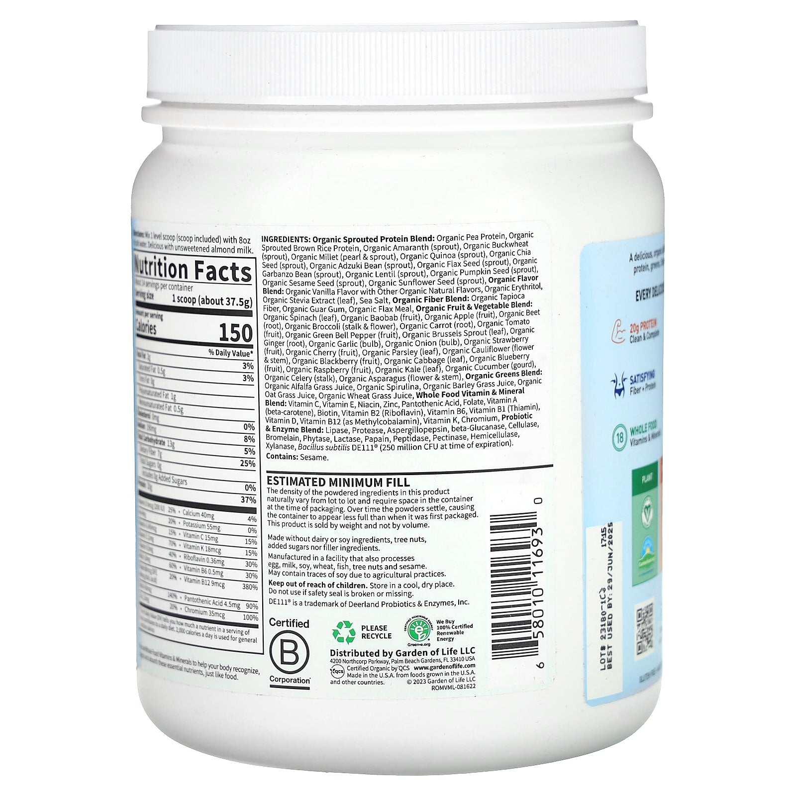 Organic sprouted protein blend: organic pea protein, organic sprouted brown rice protein, organic amaranth (sprout), organic buckwheat (sprout), organic millet (pearl & sprout), organic quinoa (sprout), organic chia seed (sprout), organic adzuki bean (sprout), organic flax seed (sprout), organic garbanzo bean (sprout), organic lentil (sprout), organic pumpkin seed (sprout), organic sesame seed (sprout), organic sunflower seed (sprout), organic flavor blend: organic vanilla flavor with other organic natural flavors, organic erythritol, organic stevia extract (leaf), sea salt, organic fiber blend: organic tapioca fiber, organic guar gum, organic flax meal, organic fruit & vegetable blend: organic spinach (leaf), organic baobab (fruit), organic apple (fruit), organic beet (root), organic broccoli (stalk & flower), organic carrot (root), organic tomato (fruit), organic green bell pepper (fruit), organic brussels sprout (leaf), organic ginger (root), organic garlic (bulb), organic onion (bulb), organic strawberry (fruit), organic cherry (fruit), organic parsley (leaf), organic cauliflower (flower & stem), organic blackberry (fruit), organic cabbage (leaf), organic blueberry (fruit), organic raspberry (fruit), organic kale (leaf), organic cucumber (gourd), organic celery (stalk), organic asparagus (flower & stem), organic greens blend: organic alfalfa grass juice, organic spirulina, organic barley grass juice, organic oat grass juice, organic wheat grass juice, whole food vitamin & mineral blend: vitamin c, vitamin e, niacin, zinc, pantothenic acid, folate, vitamin a (beta-carotene), biotin, vitamin b2 (riboflavin), vitamin b6, vitamin b1 (thiamin), vitamin d, vitamin b12 (as methylcobalamin), vitamin k, chromium, probiotic & enzyme blend: lipase, protease, aspergillopepsin, beta-glucanase, cellulase, bromelain, phytase, lactase, papain, peptidase, pectinase, hemicellulase, xylanase, bacillus subtilis de111® (250 million cfu at time of expiration).