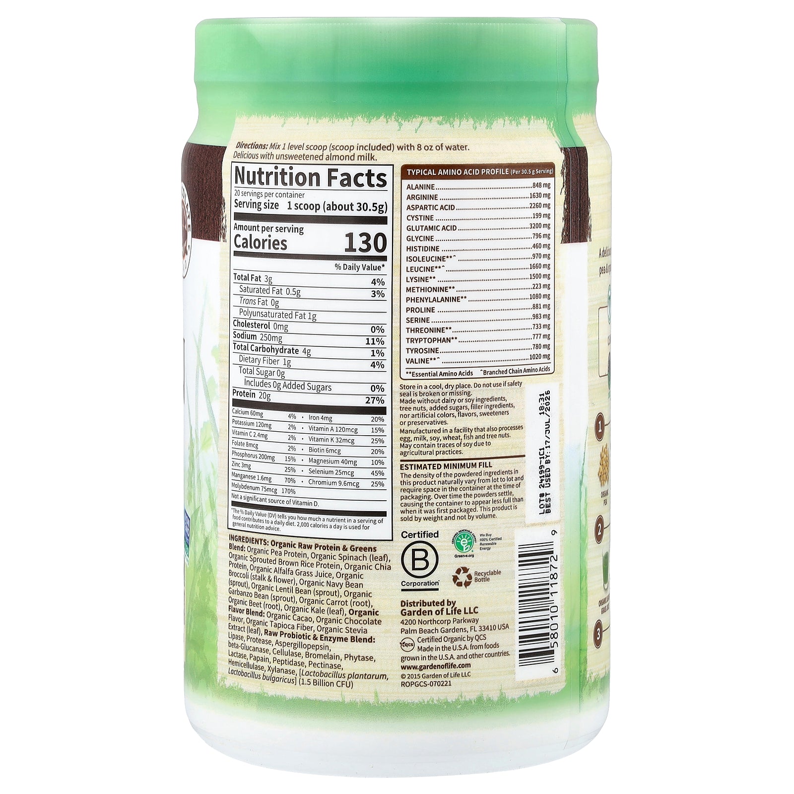 Organic raw protein & greens blend: organic pea protein, organic spinach (leaf), organic sprouted brown rice protein, organic chia protein, organic alfalfa grass juice, organic broccoli (stalk & flower), organic navy bean (sprout), organic lentil bean (sprout), organic garbanzo bean (sprout), organic carrot (root), organic beet (root), organic kale (leaf), organic flavor blend: organic cacao, organic chocolate flavor, organic tapioca fiber, organic stevia extract (leaf), raw probiotic & enzyme blend: lipase, protease, aspergillopepsin, beta-glucanase, cellulase, bromelain, phytase, lactase, papain, peptidase, pectinase, hemicellulase, xylanase, [lactobacillus plantarum, lactobacillus bulgaricus] (1.5 Billion CFU).