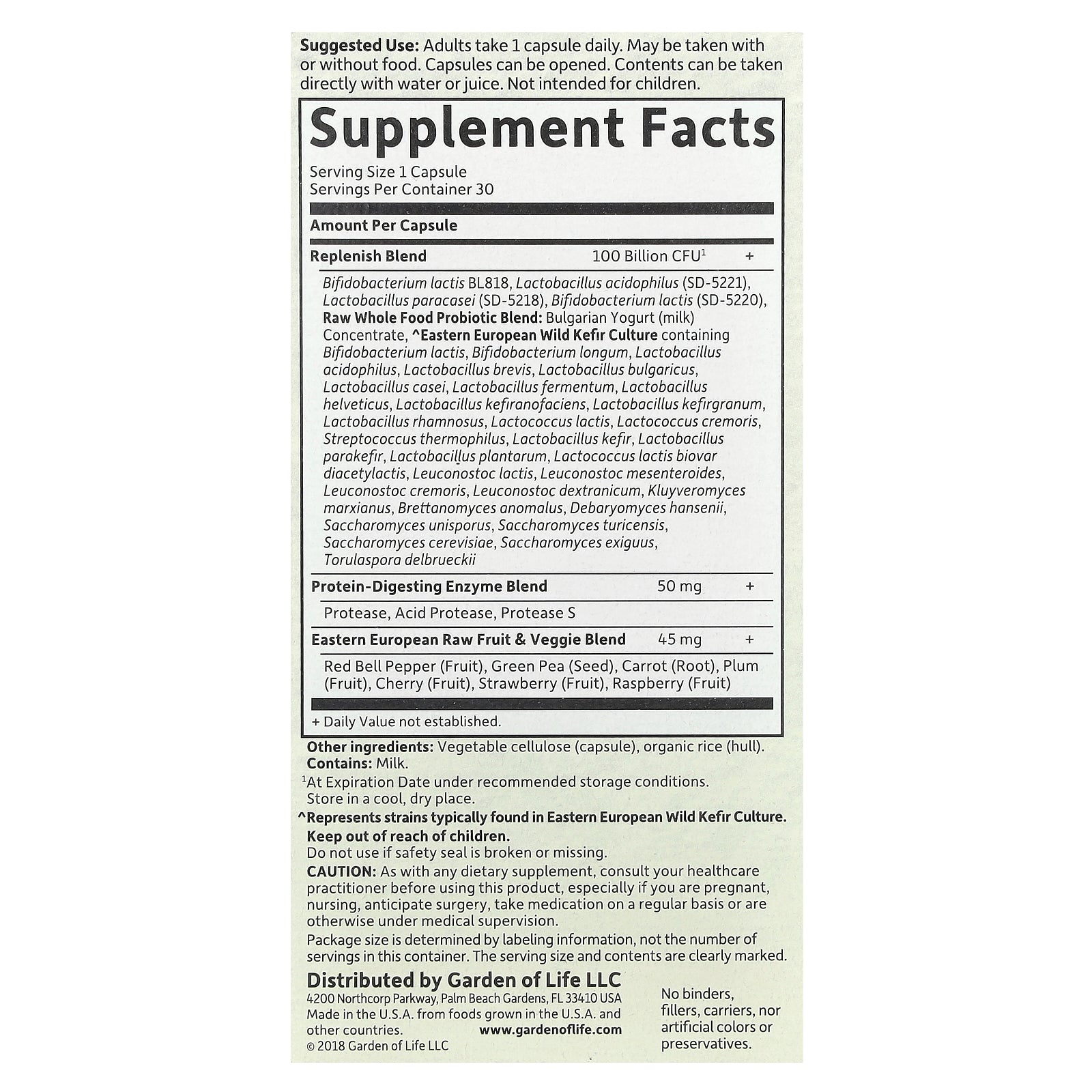 Replenish Blend Bifidobacterium lactis BL818, Lactobacillus acidophilus (SD-5221), Lactobacillus paracasei (SD-5218), Bifidobacterium lactis (SD-5220), Raw Whole Food Probiotic Blend: Bulgarian Yogurt (milk) Concentrate, ^Eastern European Wild Kefir Culture containing Bifidobacterium lactis, Bifidobacterium longum, Lactobacillus acidophilus, Lactobacillus brevis, Lactobacillus bulgaricus, Lactobacillus casei, Lactobacillus fermentum, Lactobacillus helveticus, Lactobacillus kefiranofaciens, Lactobacillus kefirgranum, Lactobacillus rhamnosus, Lactococcus lactis, Lactococcus cremoris, Streptococcus thermophilus, Lactobacillus kefir, Lactobacillus parakefir, Lactobacillus plantarum, Lactococcus lactis biovar diacetylactis, Leuconostoc lactis, Leuconostoc mesenteroides, Leuconostoc cremoris, Leuconostoc dextranicum, Kluyveromyces marxianus, Brettanomyces anomalus, Debaryomyces hansenii, Saccharomyces unisporus, Saccharomyces turicensis, Saccharomyces cerevisiae, Saccharomyces exiguus, Torulaspora delbrueckii |