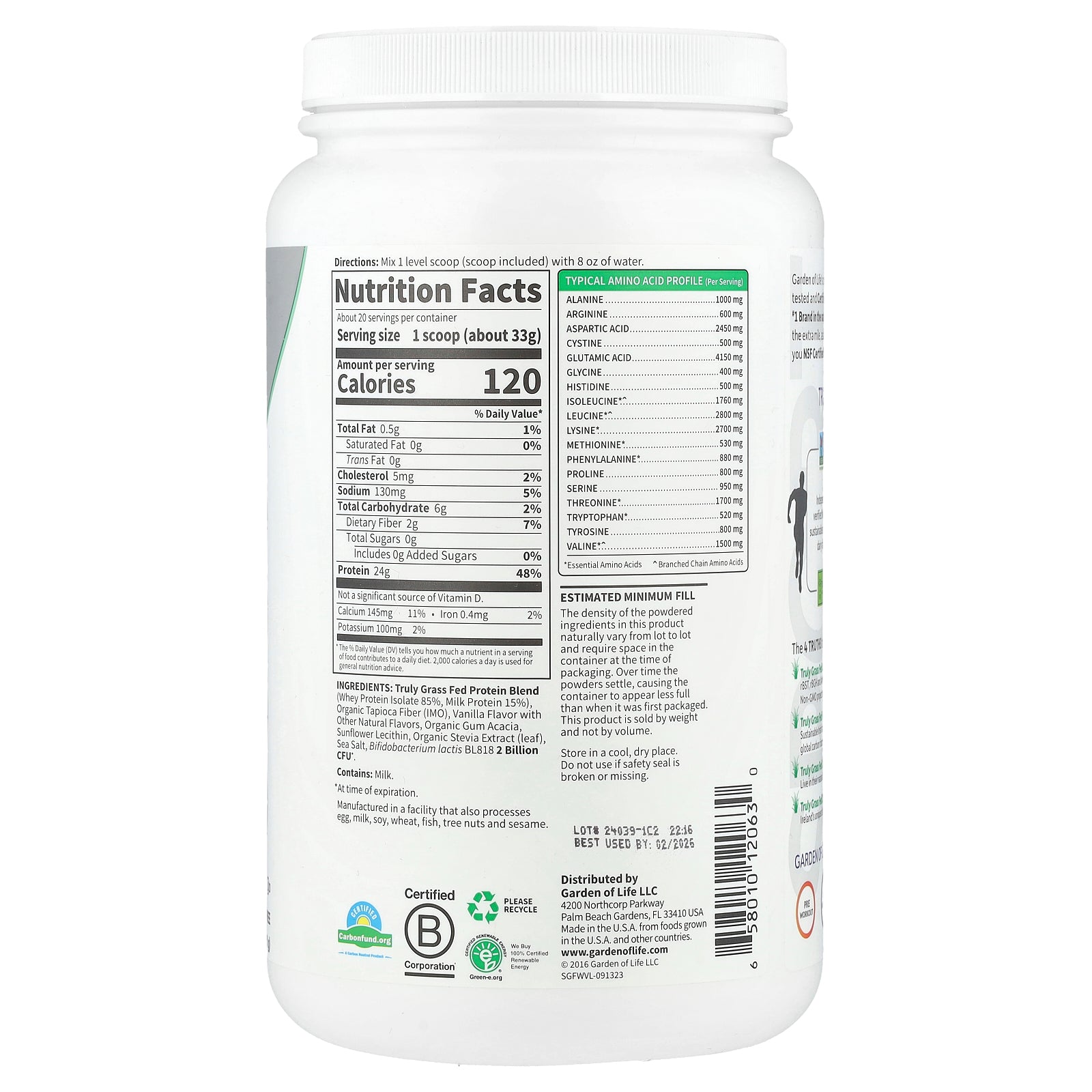 Truly grass fed protein blend (whey protein isolate 85%, milk protein 15%), organic tapioca fiber (IMO), vanilla flavor with other natural flavors, organic gum acacia, sunflower lecithin, organic stevia extract (leaf), sea salt, bifidobacterium lactis Bl818 2 billion CFU*.