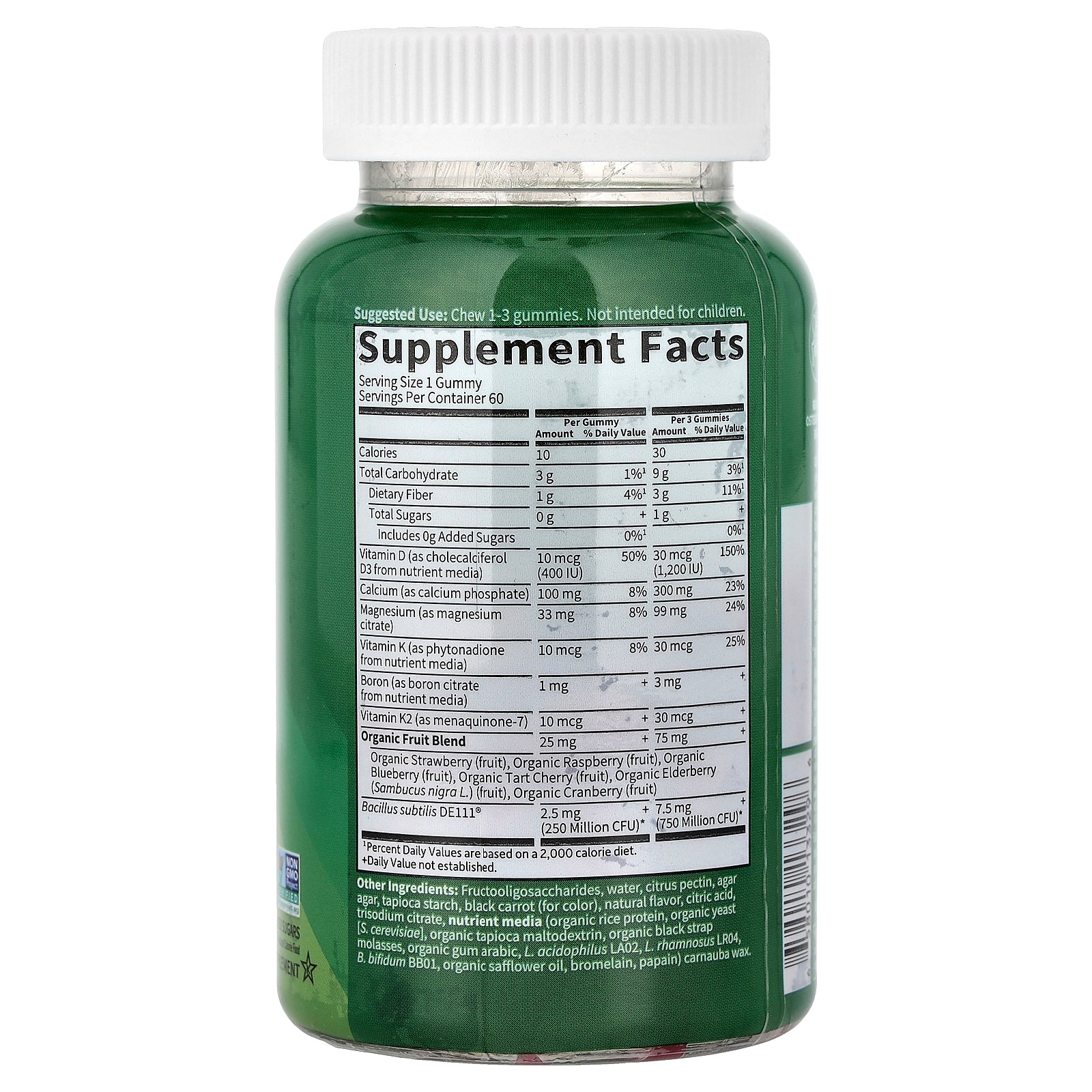 ²Based on 3 gummies daily. Regular exercise and a healthy diet with enough Calcium and Vitamin D helps you maintain good bone health and may reduce the risk of osteoporosis later in life.