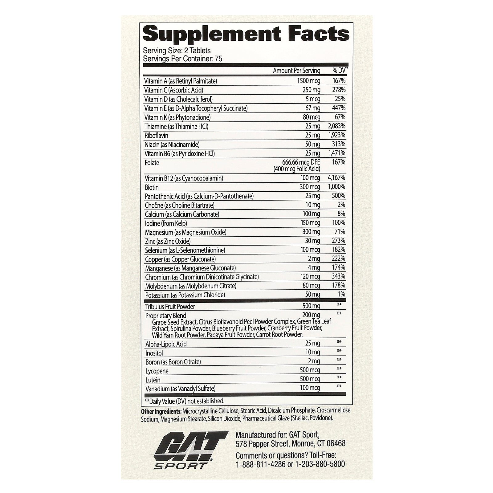 Mens Multi+Test is a complete vitamin, mineral and energy multivitamin with added men's virility ingredient Tribulus Terristis. GAT Mens Multi offers athletes complete support for nutrient deficiencies they may need with an added virility and testosterone boost.