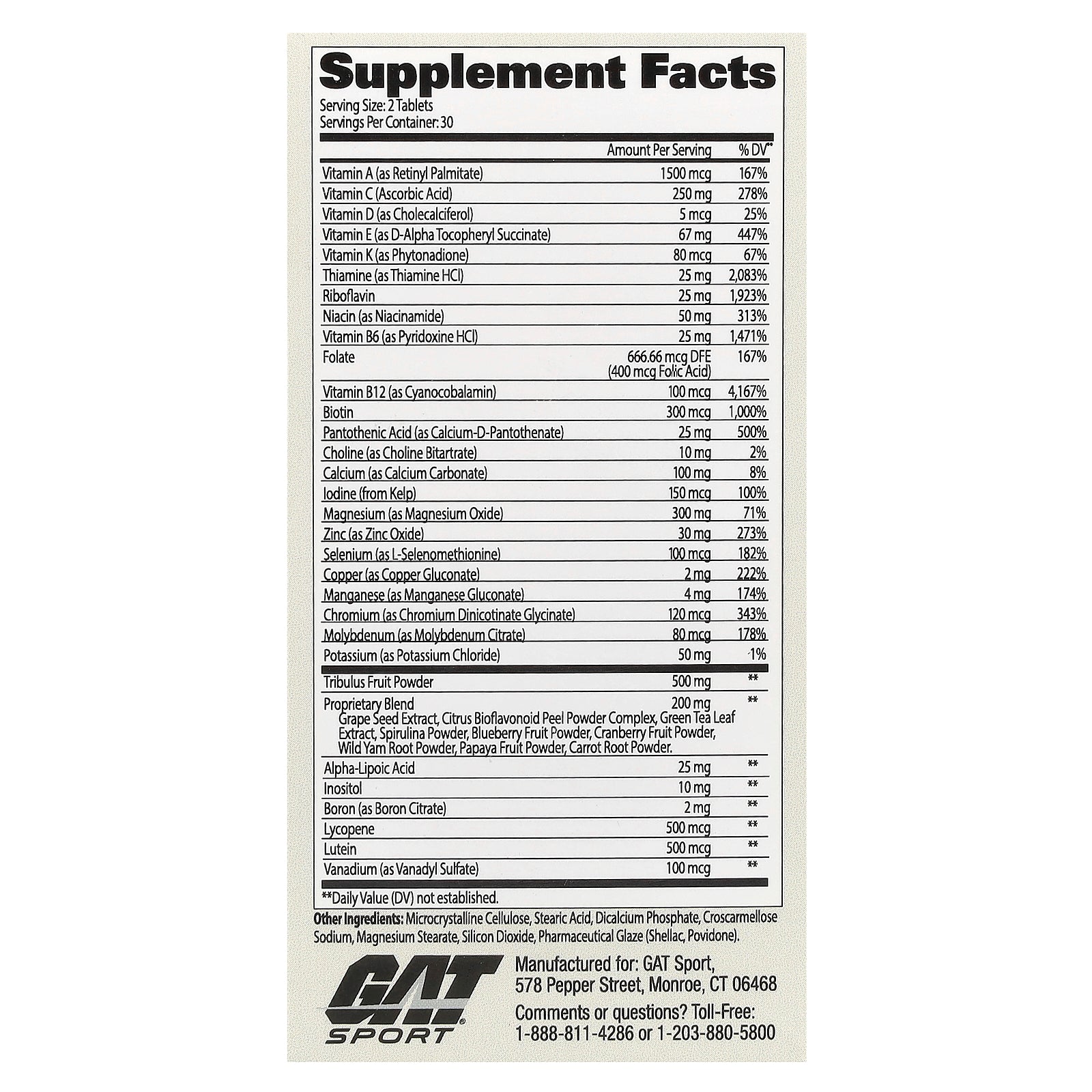 Mens Multi+Test is a complete vitamin, mineral and energy multivitamin with added men's virility ingredient Tribulus Terristis. GAT Mens Multi offers athletes complete support for nutrient deficiencies they may need with an added virility and testosterone boost.