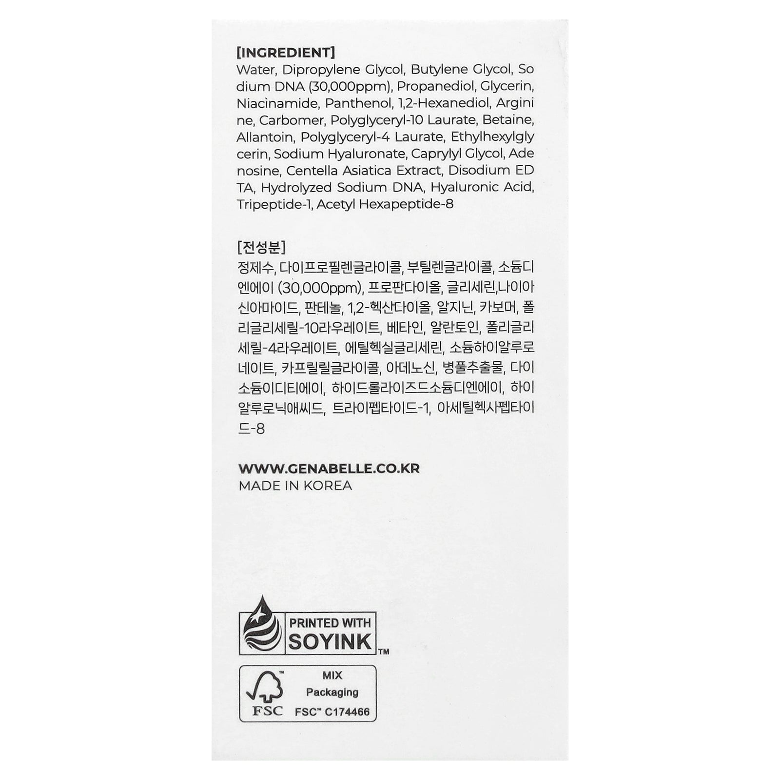 Water, dipropylene glycol, butylene glycol, sodium dna (30,000ppm), propanediol, glycerin, niacinamide, panthenol, 1,2-hexanediol, arginine, carbomer, polyglyceryl-10 laurate, betaine, allantoin, polyglyceryl-4 laurate, ethylhexylglycerin, sodium hyaluronate, caprylyl glycol, adenosine, centella asiatica extract, disodium edta, hydrolyzed sodium dna, hyaluronic acid, tripeptide-1, acetyl hexapeptide-8.