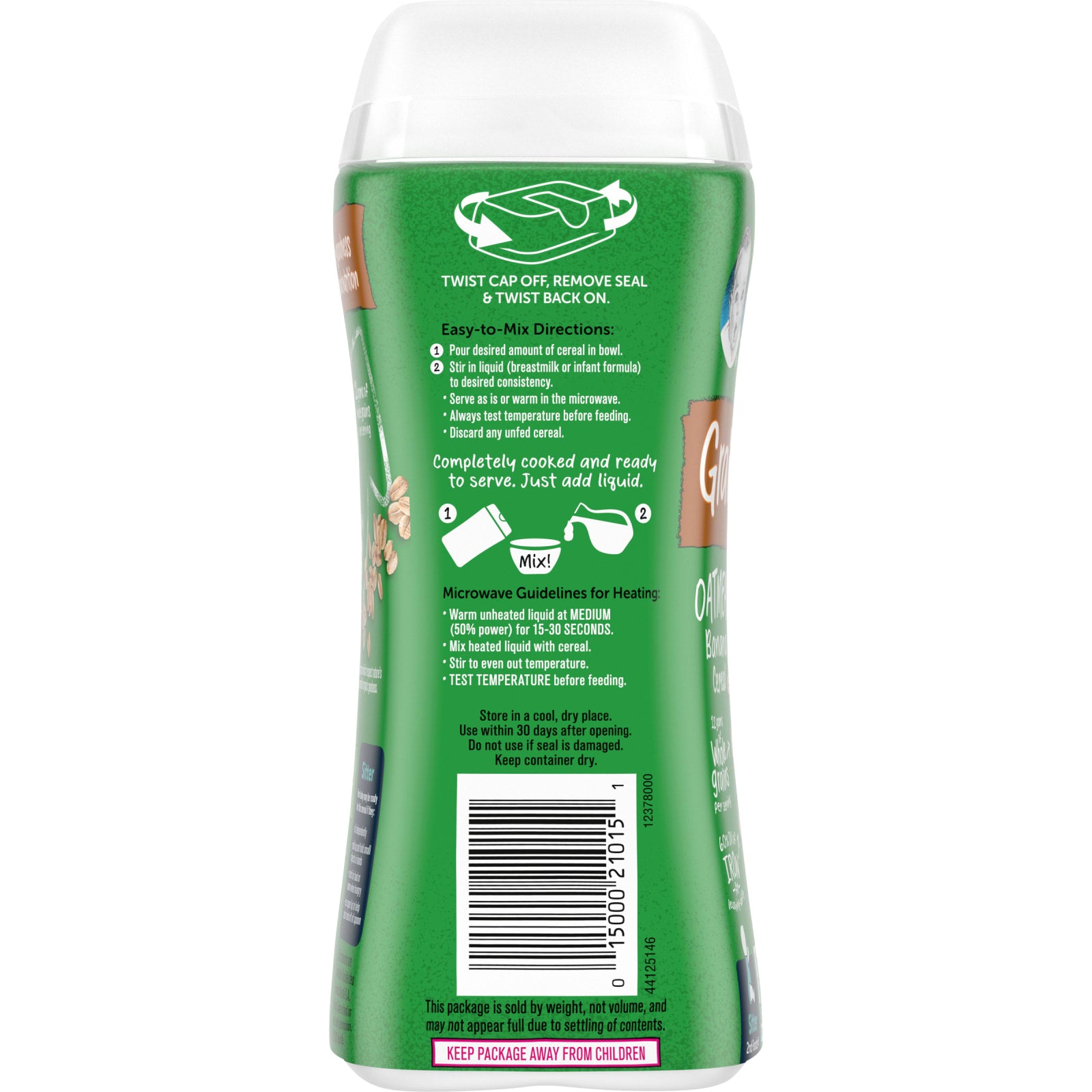 - Stir in liquid (breastmilk or infant formula) to desired consistency.