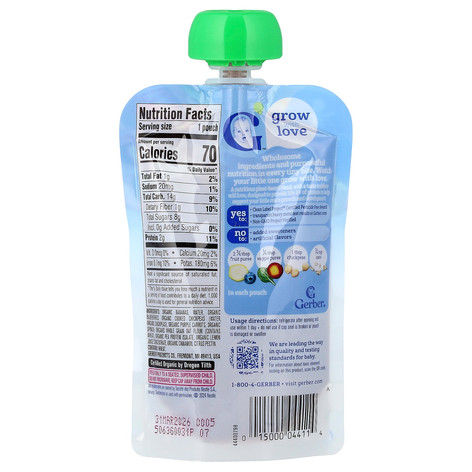 Organic bananas, water, organic blueberries, organic cooked chickpeas (water, organic chickpeas), organic purple carrots, organic spinach, organic whole grain oat flour (contains wheat), organic pea protein isolate, organic lemon juice concentrate, organic cinnamon, citrus pectin.